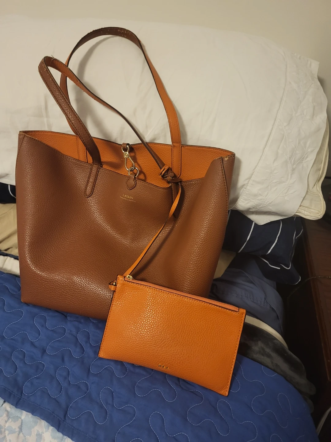 Selling a Lauren Ralph Lauren reversible tote bag. It's brown on one side and orange on the other, giving you two looks in one! Comes with a matching orange wristlet.
