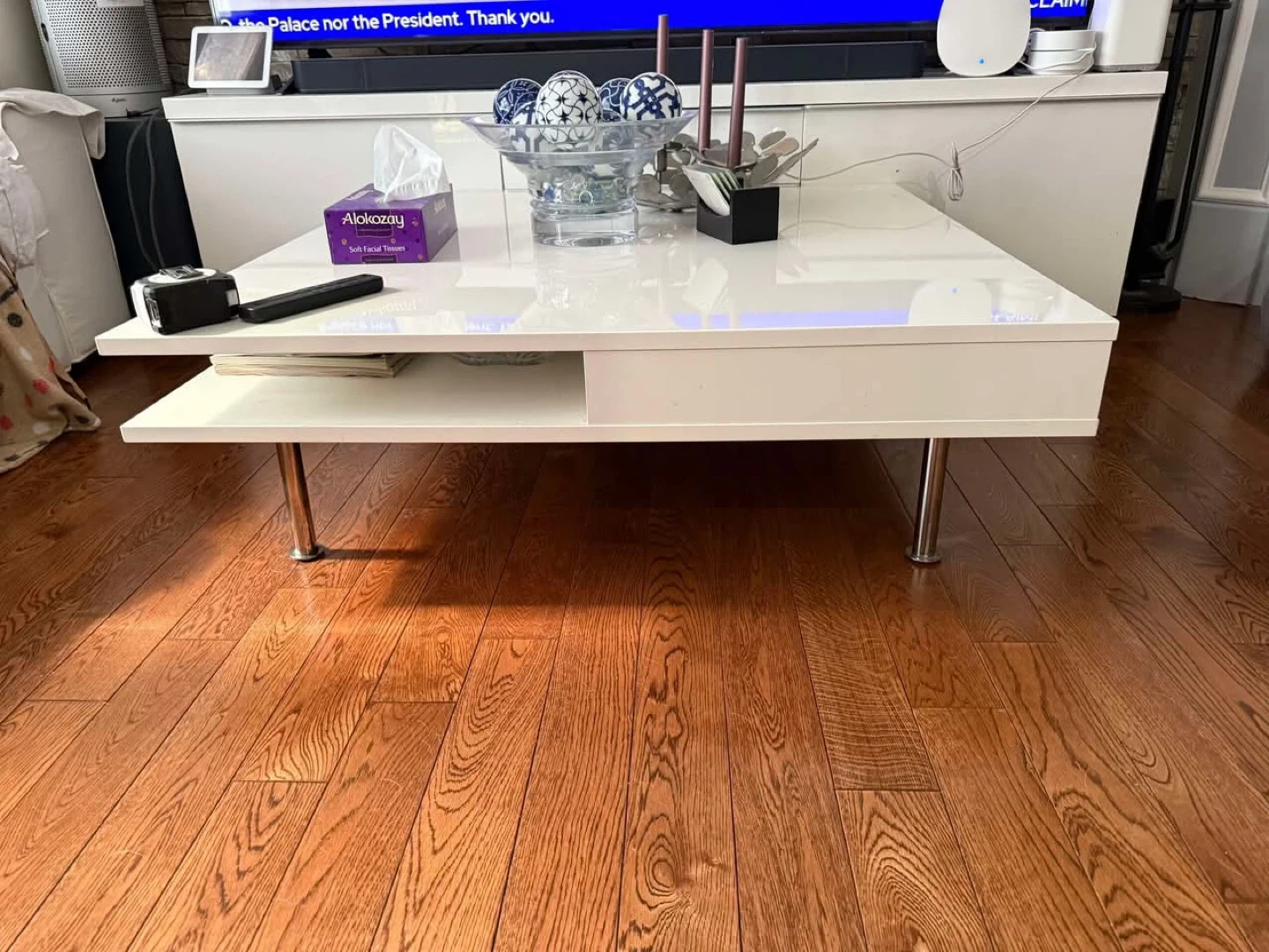 Selling a modern coffee table with a sleek white finish. It features a clean, minimalist design with chrome legs and a convenient shelf for storage. It's in great condition and perfect for any living room!