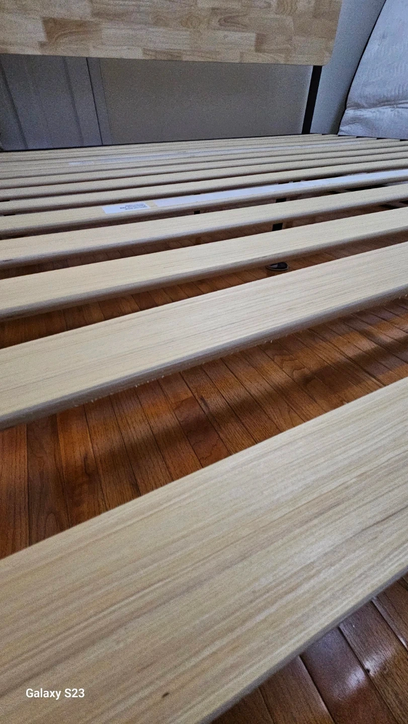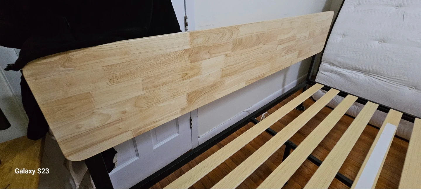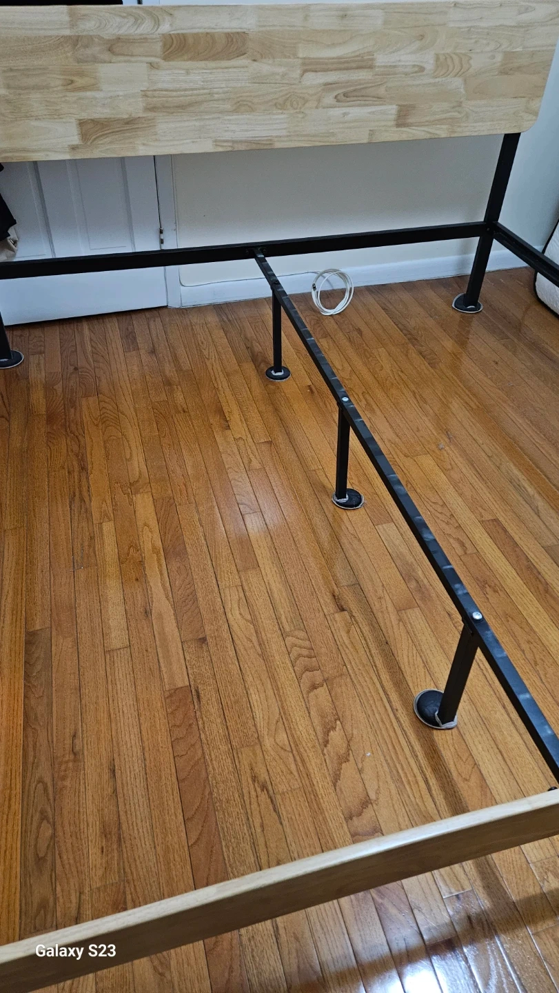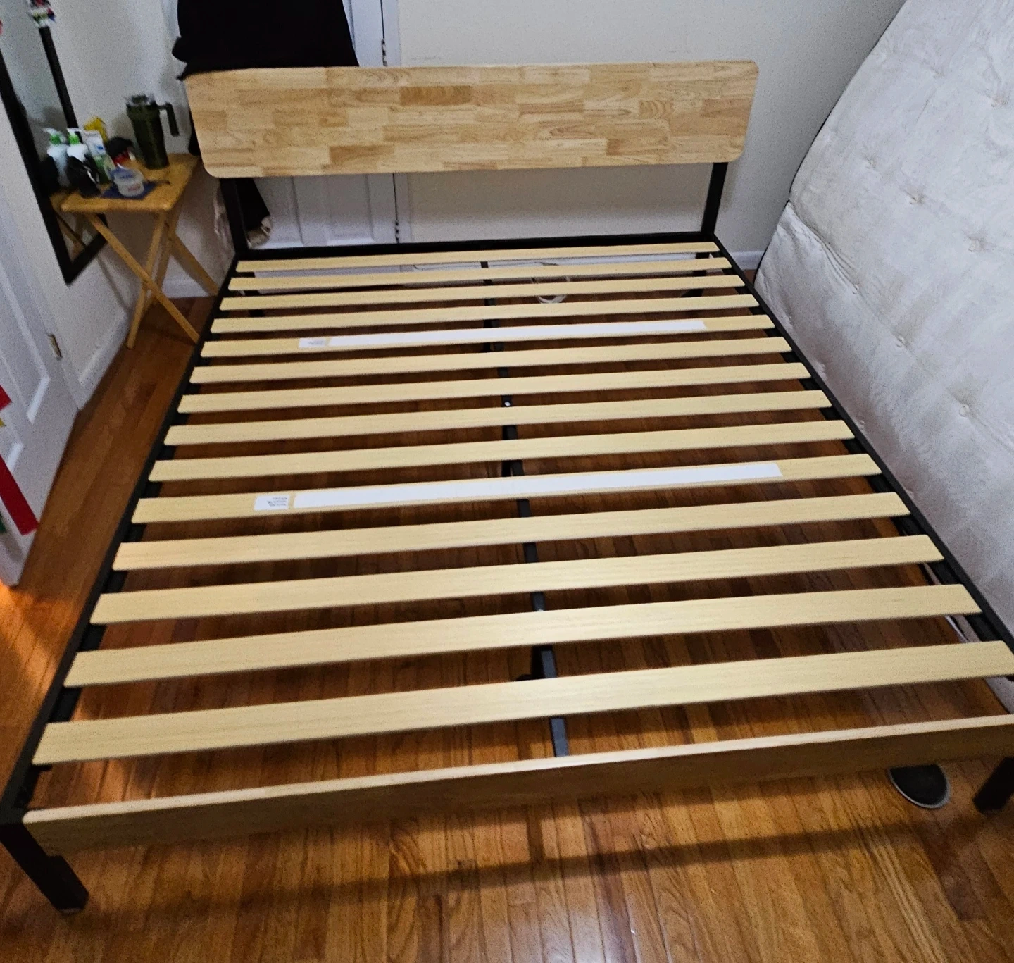 Selling a Zinus platform bed frame in king size. The frame has a wooden headboard and a black metal frame. The headboard is made with sustainable bamboo. It's durable, strong, and easy to clean. Dimensions are 78.5" x 80.5"