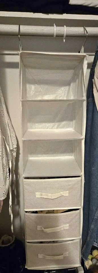 • Hanging closet organizer with fabric drawers