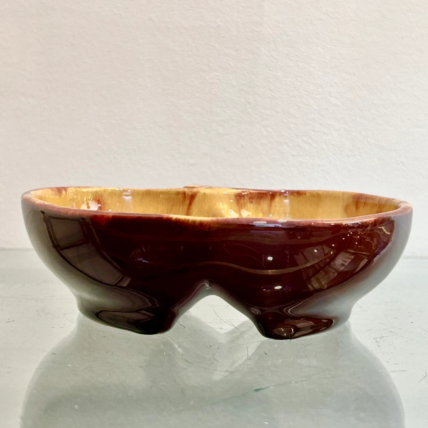 Mid-century modern, MCM pottery, studio pottery, drip glaze, run glaze, oxblood glaze, amber glaze, apple dish, divided dish, relish dish, condiment dish, vintage art pottery, sculptural ceramics.