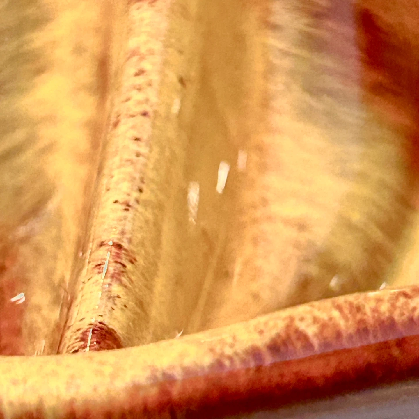 The form is beautifully modeled with a raised central “rib” divider and stylized stem, creating two deep wells. Glazing is the star: a lustrous oxblood / aubergine exterior with a warm honey-amber interior, showing natural kiln-flow, feathering, and pooling at the contours—exactly the kind of movement collectors look for in 1950s–1970s North American studio-style pottery.