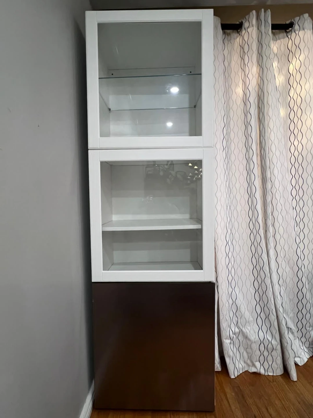 Selling a used IKEA Besta combination with a glass door. This unit features adjustable shelves and a sleek design. The bookcase is white with a dark brown base and two glass cabinet doors. Dimensions are approximately 42 cm (16 1/2") wide, 60 cm (23 5/8") deep, and 193 cm (76") tall.