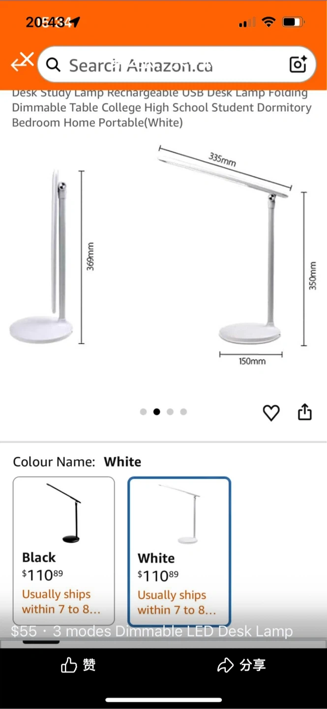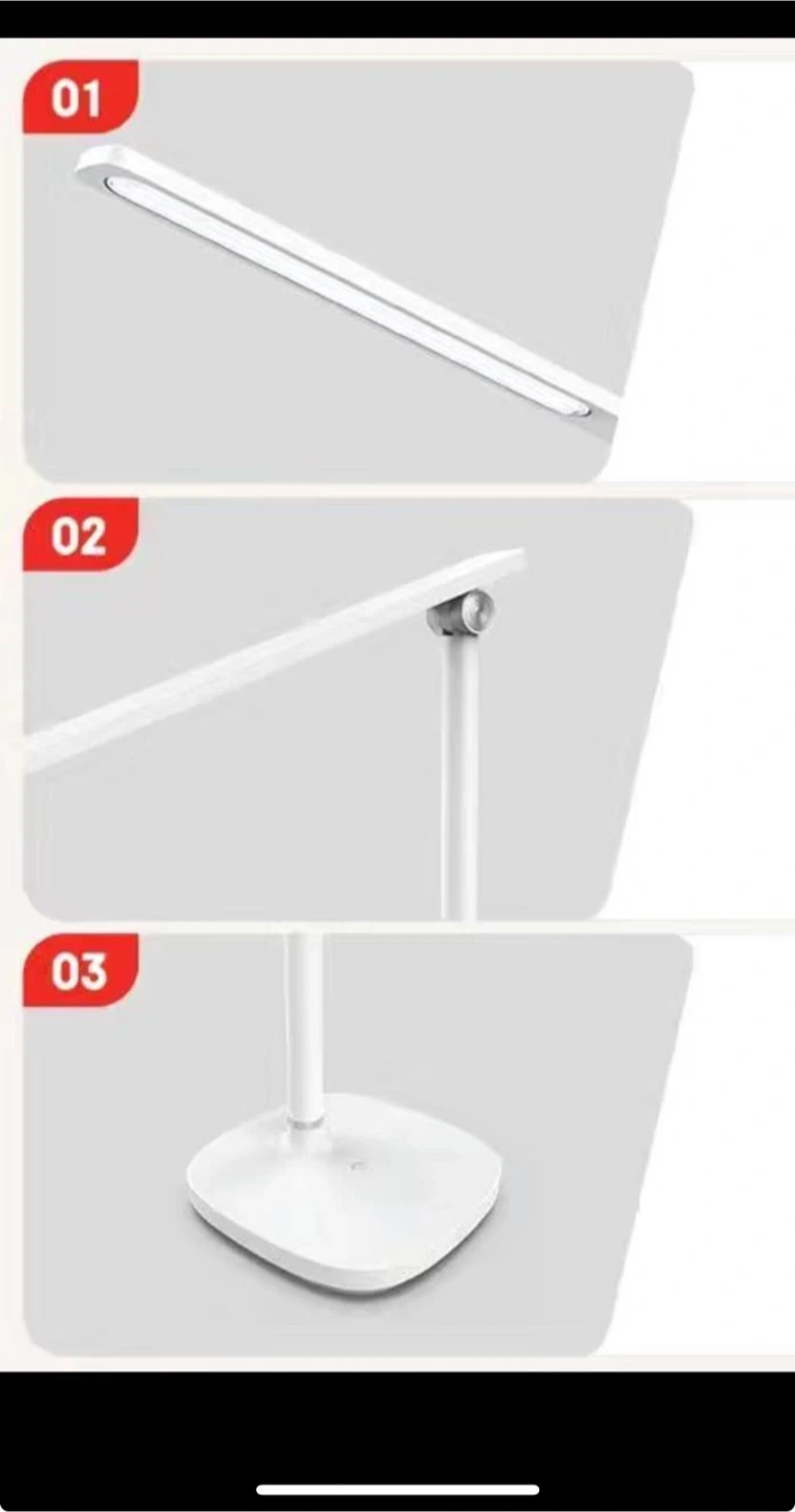Selling a dimmable LED desk lamp in white! It's perfect for a desk, study, or bedside table. It's rechargeable and has a USB port. The lamp folds for easy storage and portability. It measures 335mm wide, 369mm high, and has a 150mm base