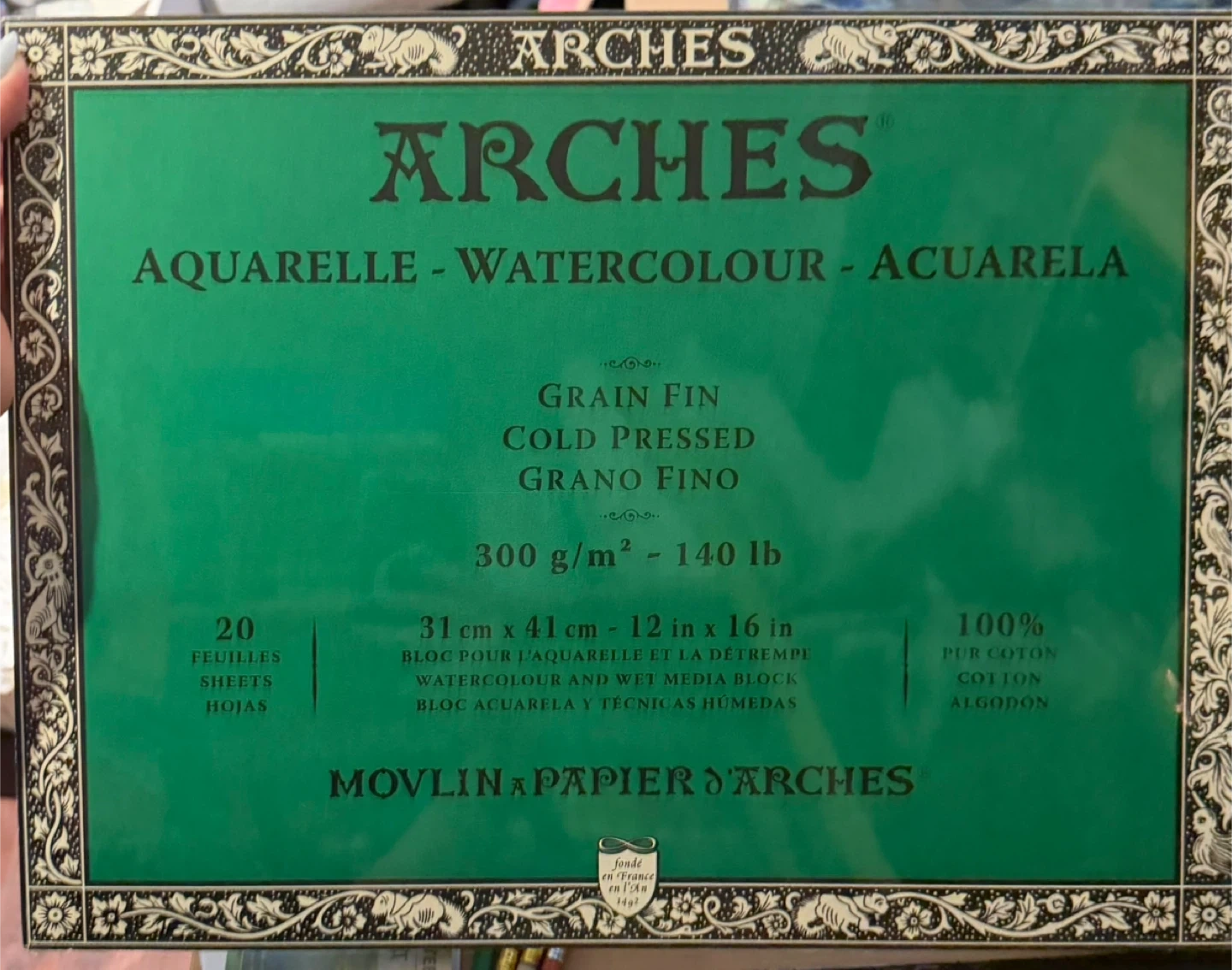 Selling Arches Aquarelle watercolour paper. 100% cotton, 20 sheets of cold-pressed, grain fin paper. 31 cm x 41 cm (12 in x 16 in) and weighs 300 g/m² (140 lb)