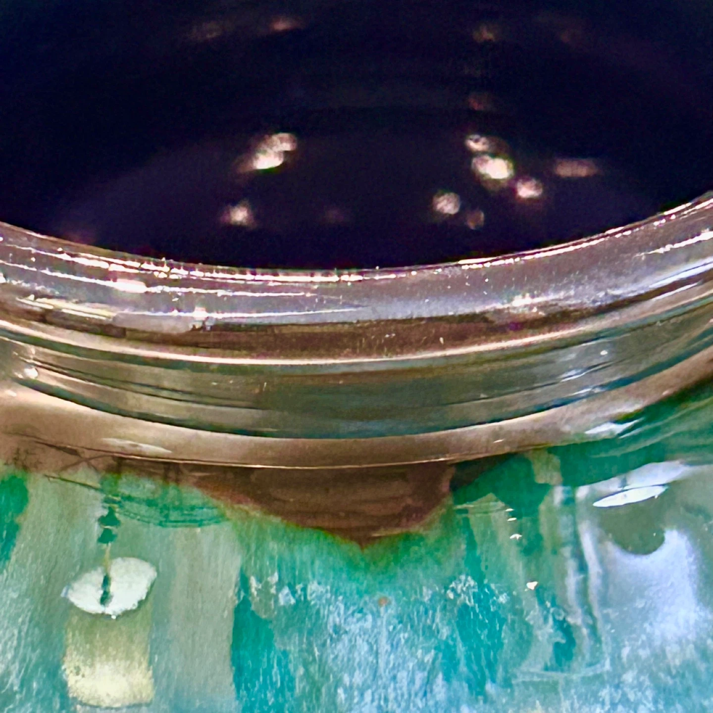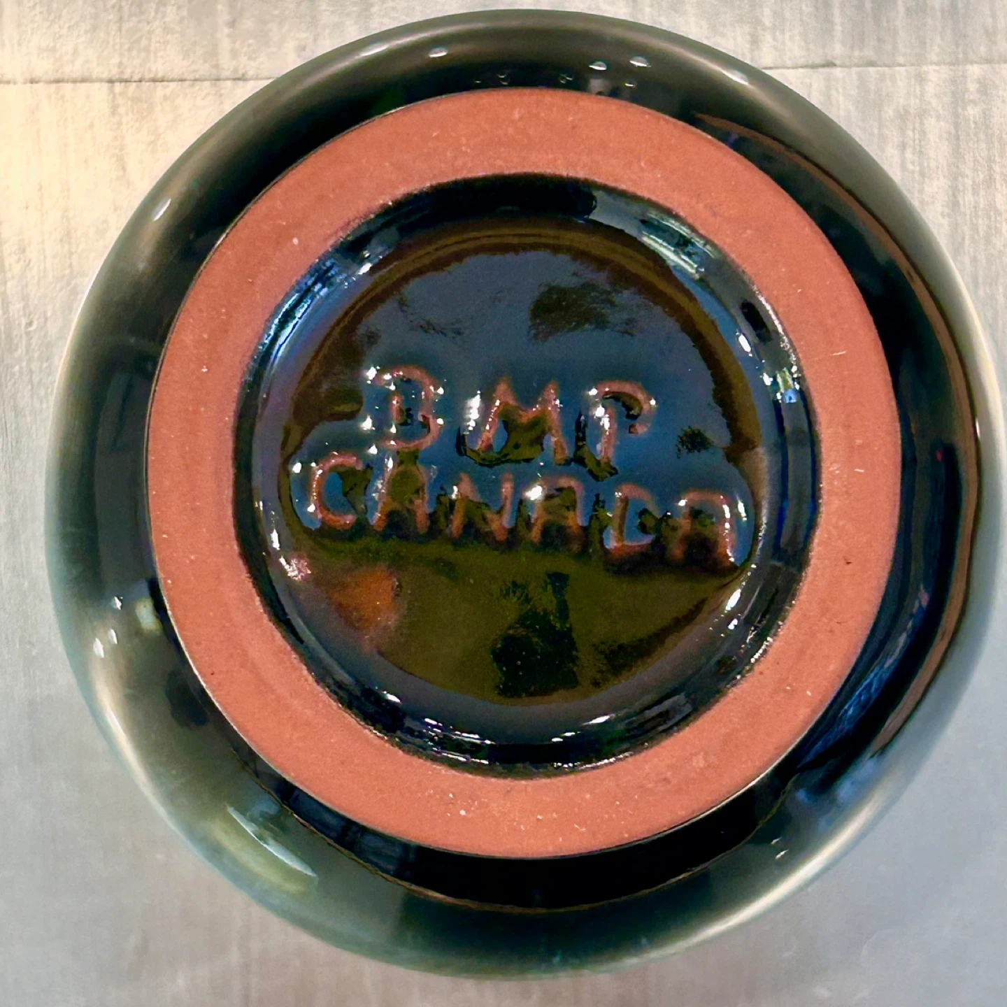 High-fired Canadian pottery with a glossy flow/drip glaze effect (intentional variation, pooling, and movement are part of the design and are highly collectible in BMP).