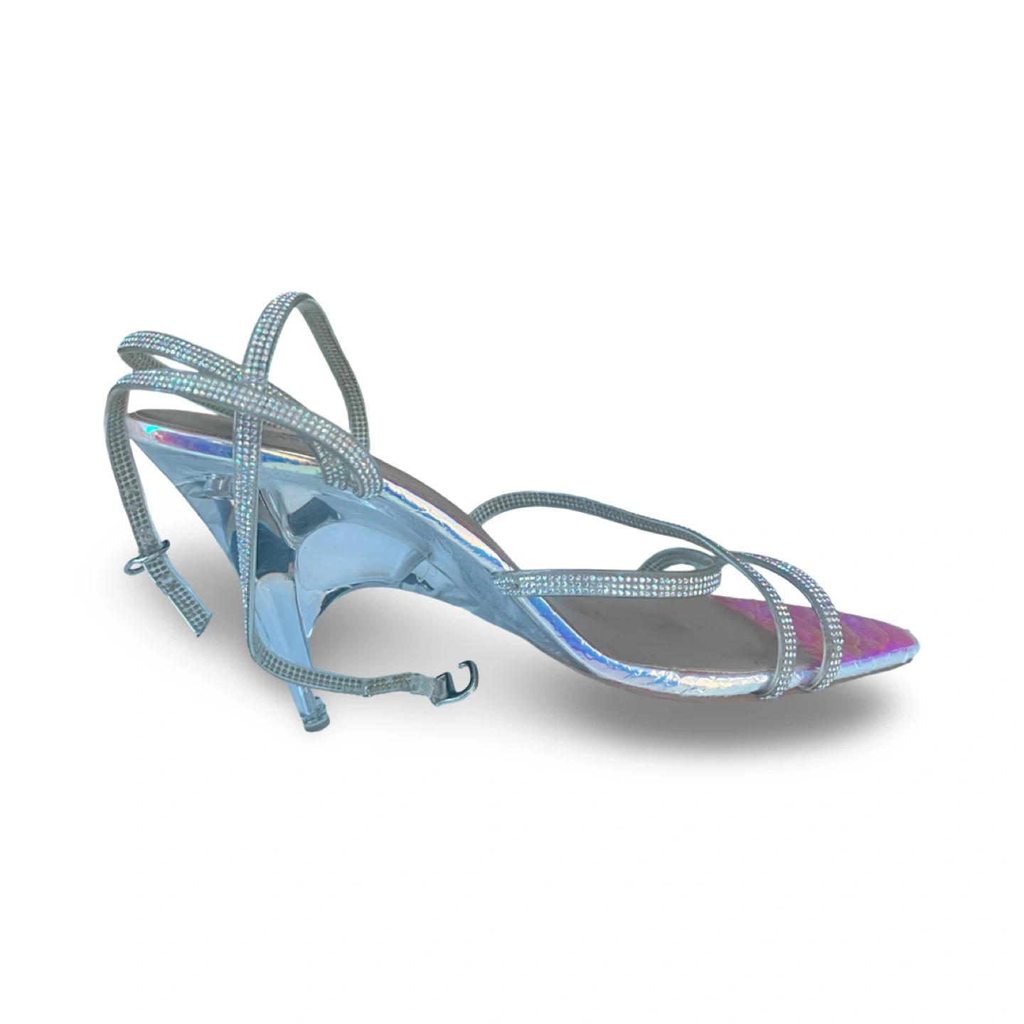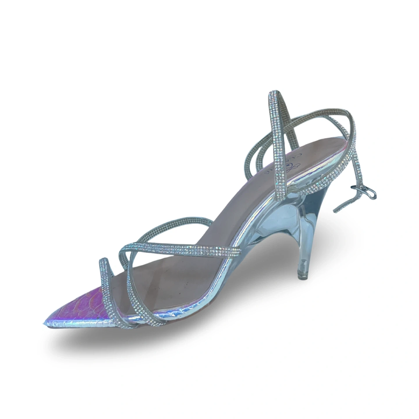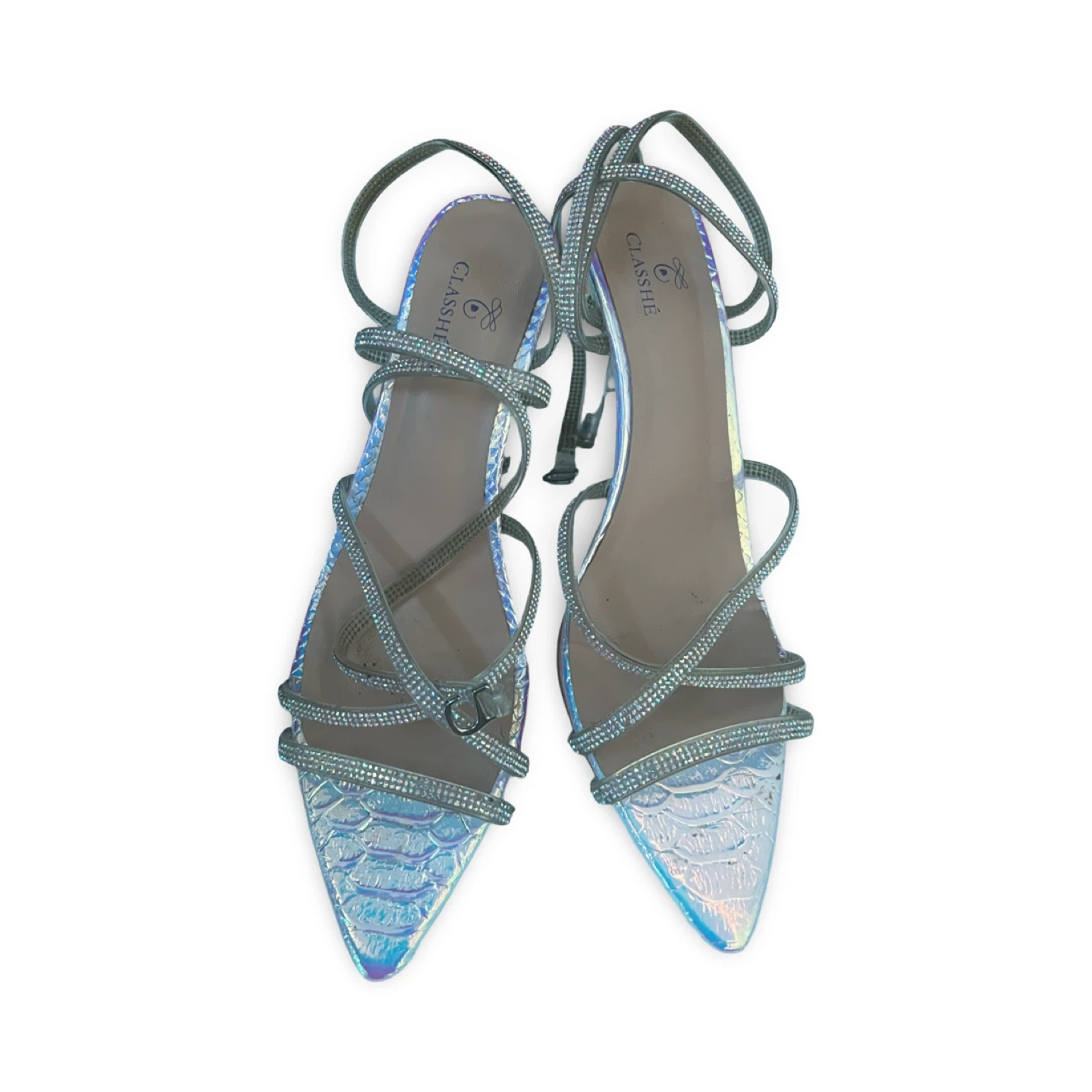 Stunning CLASSHÉ strappy heels with an iridescent pointed toe and delicate rhinestone straps. Elegant and eye-catching, perfect for events, nights out, or special occasions.