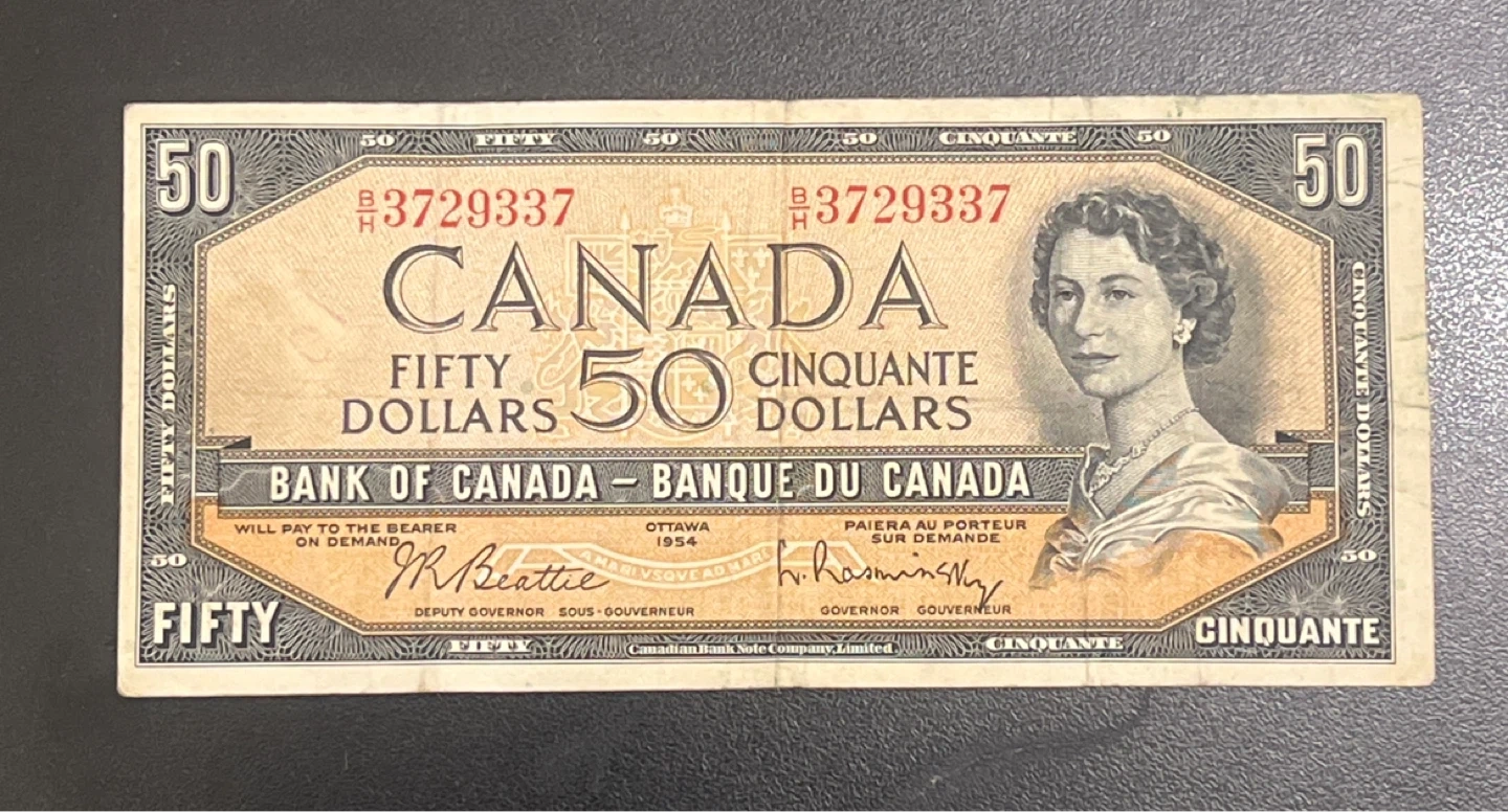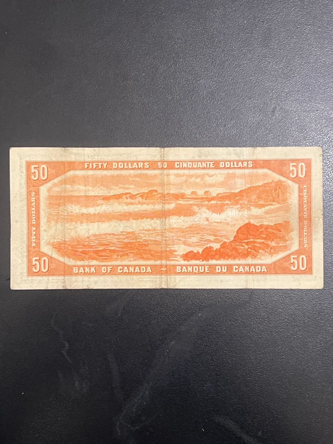 Selling a vintage Canada Fifty Dollar bill. It features a portrait and intricate designs. A great piece for collectors!