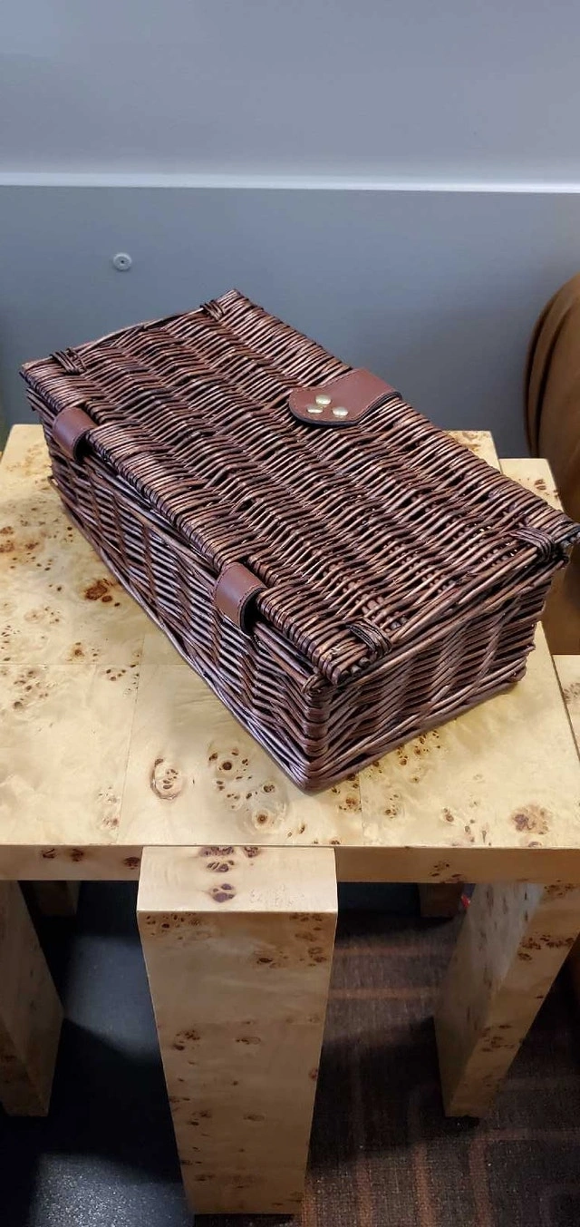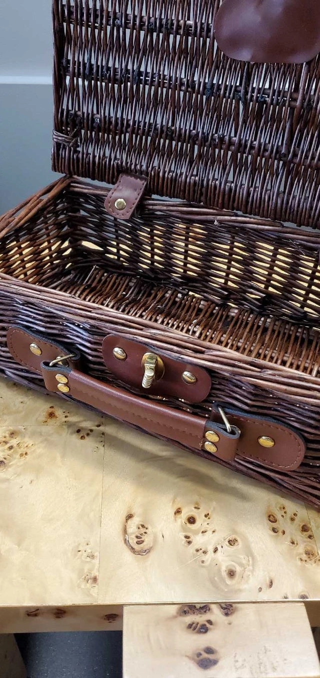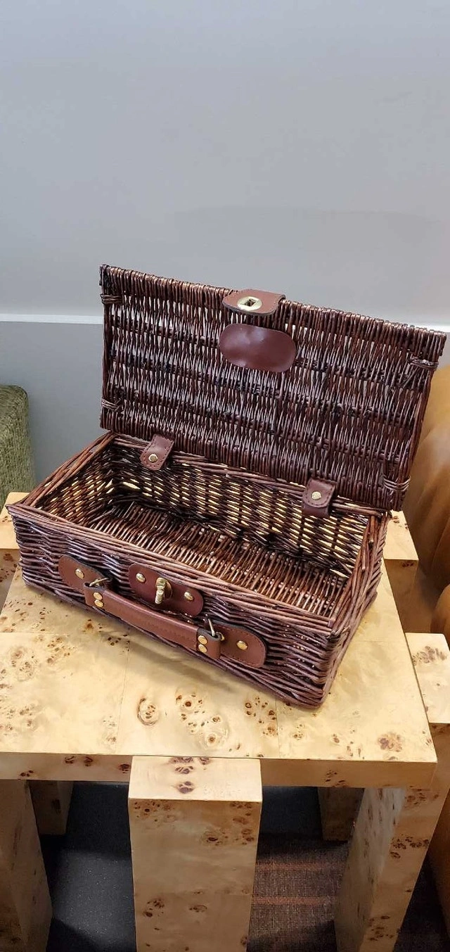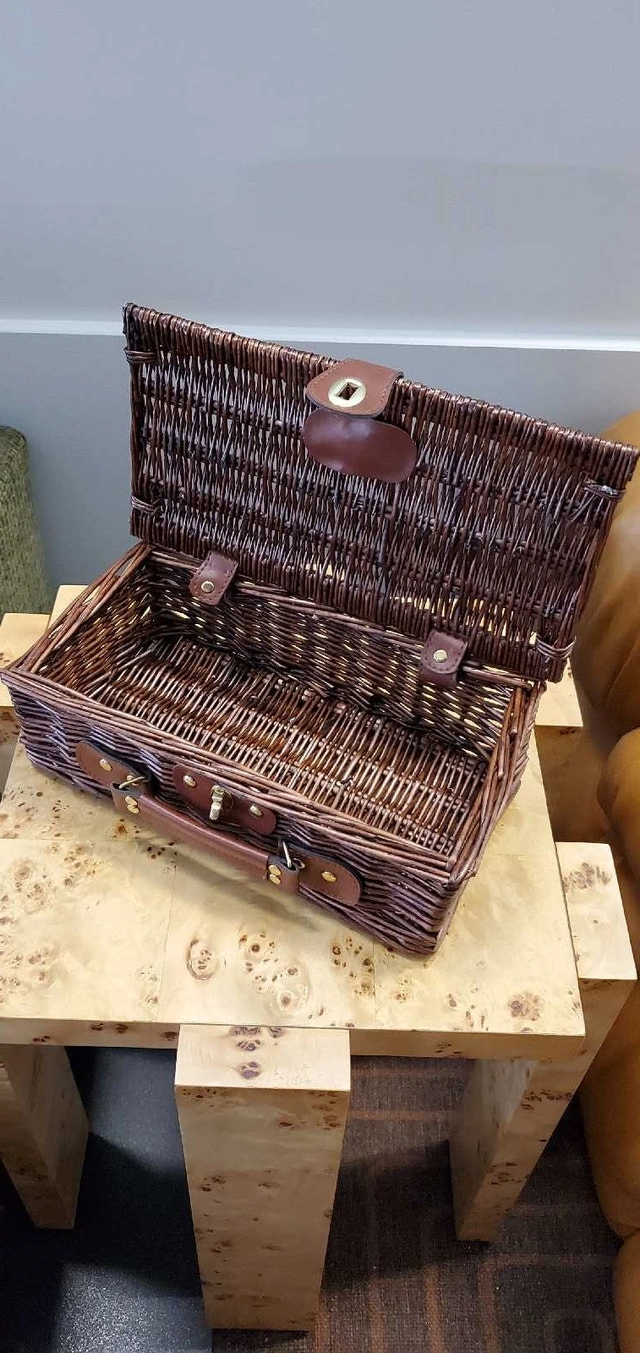 This is a vintage wicker basket with a leather handle and closures, perfect for woven/silk/jewelry, all in stylish storage. This basket still in brand new condition ✅️ Features: * Sturdy wicker construction * Leather handle and closures * Classic design Looking to add a touch of rustic elegance to your outings? This basket is ready to be your trusty companion! And hey, if you're seeing this ad, the basket is still up for grabs! Based on similar listings on Kijiji, a fair price for this basket is between $25 and $45. I've priced it at $5, reflecting its excellent quality and condition. ( See Pictures for Dimensions ) ✅️