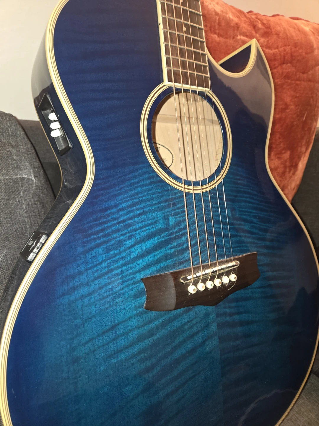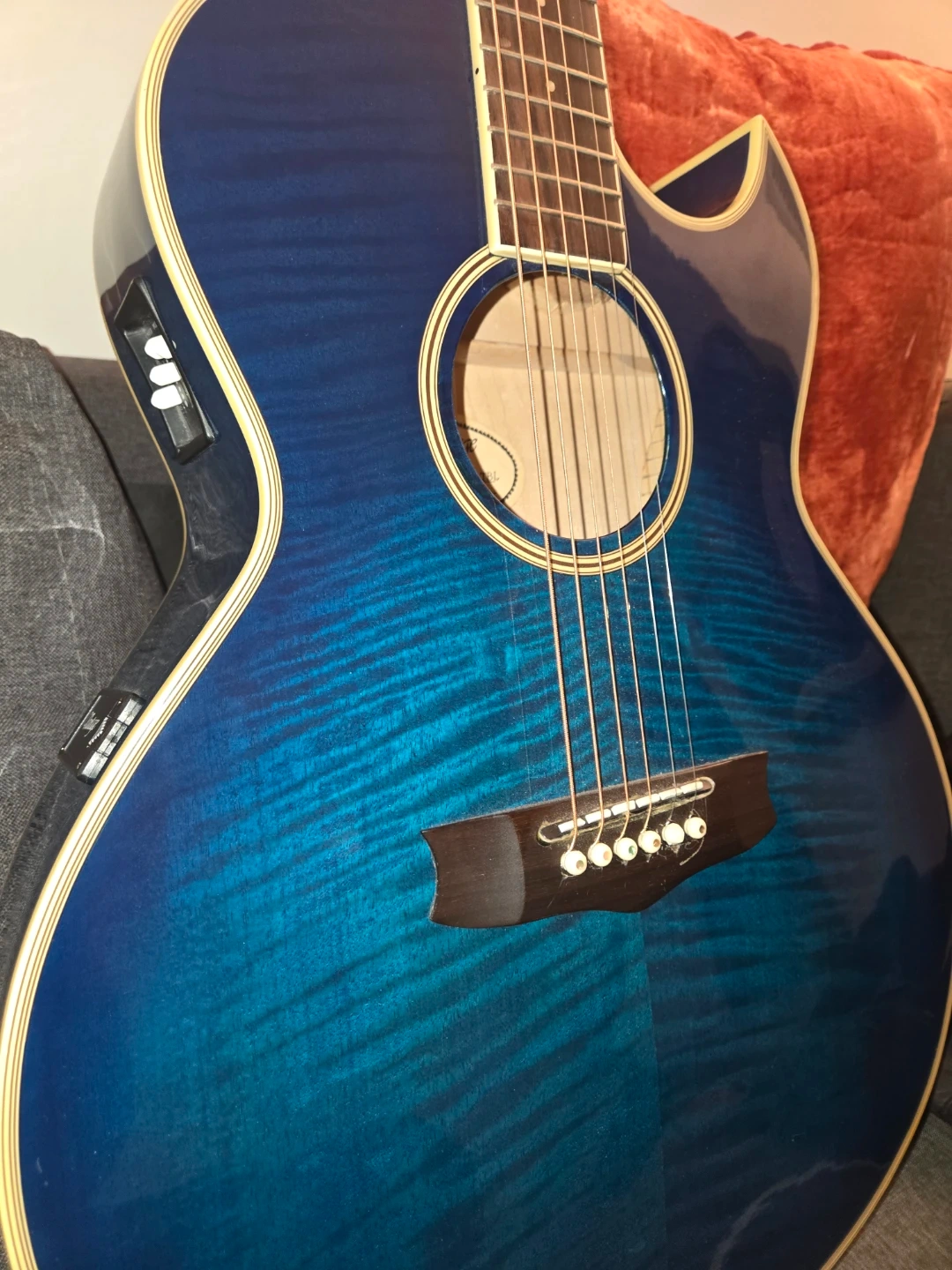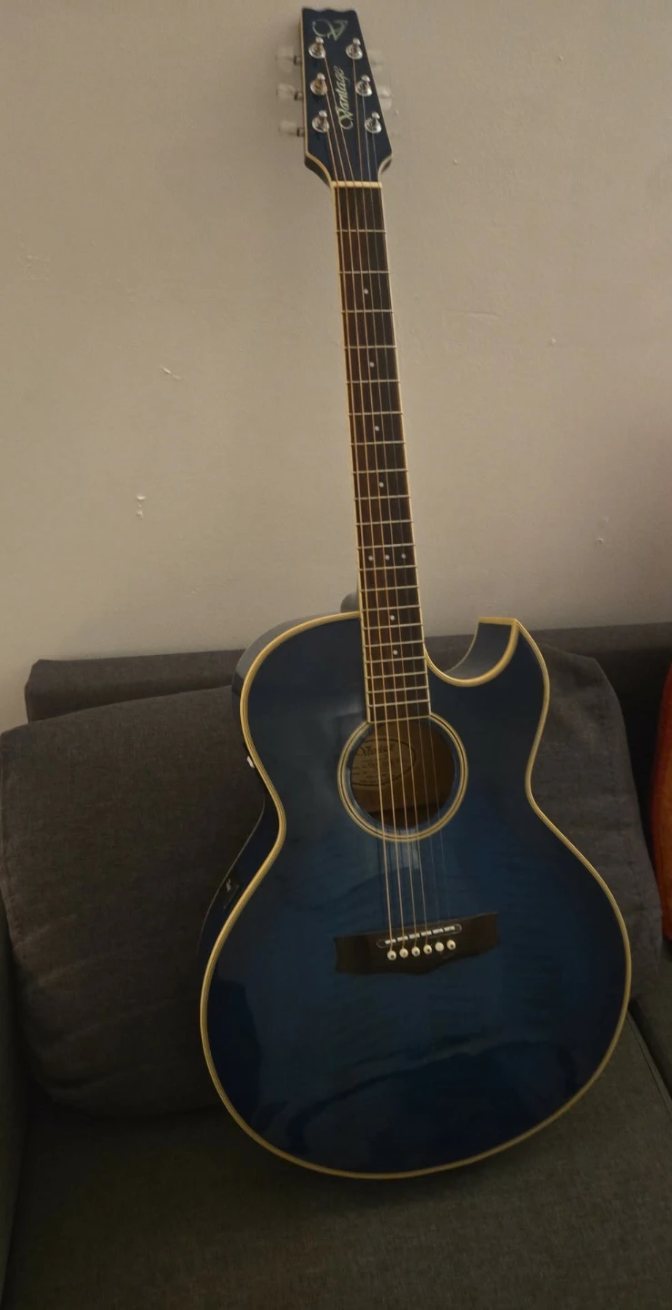 This is a beautiful Vantage vsr-90ce-tbl acoustic-electric guitar in a stunning blue finish! It would make a fantastic addition to any musician's collection or fun guitar to snap out and show off!