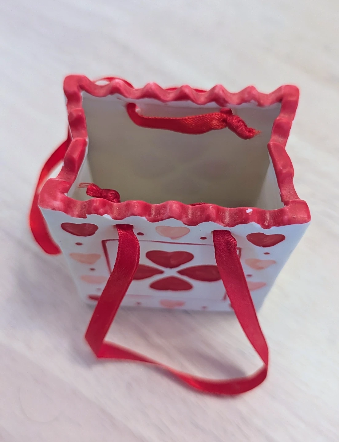 This cute ceramic bag features a lovely heart design and a red ribbon handle. Perfect for adding a touch of charm to any room! It's in great condition and ready to brighten up your space