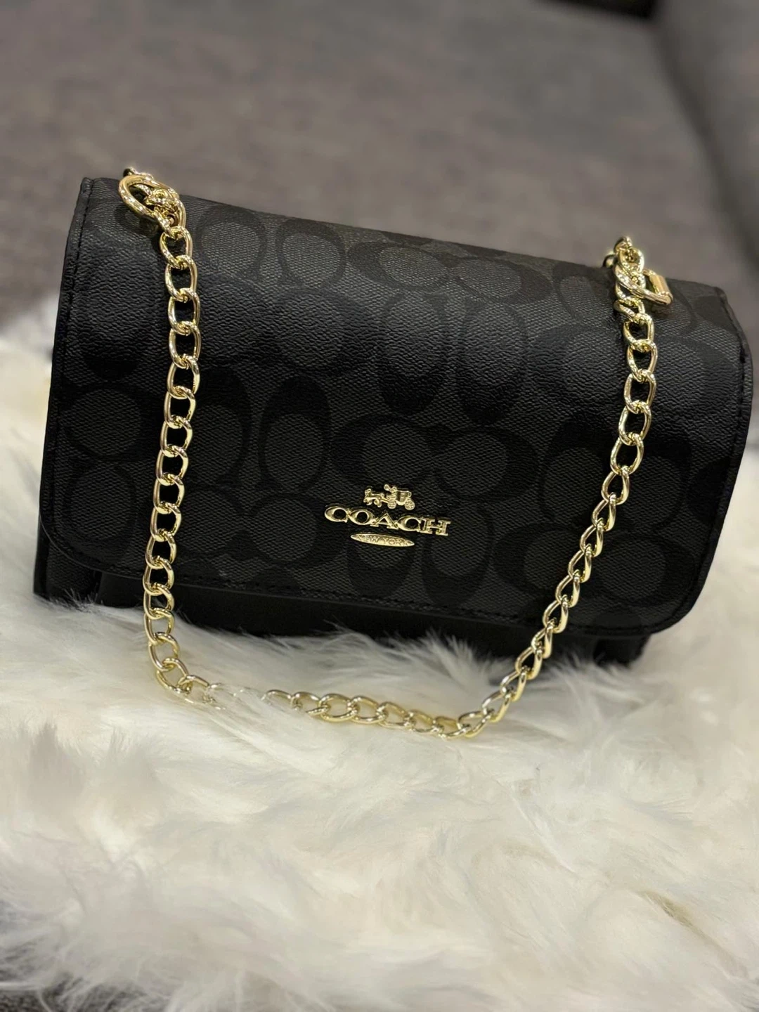 Selling a Coach crossbody bag in black. It features a gold chain strap and the classic Coach logo pattern. Perfect for adding a touch of elegance to any outfit!