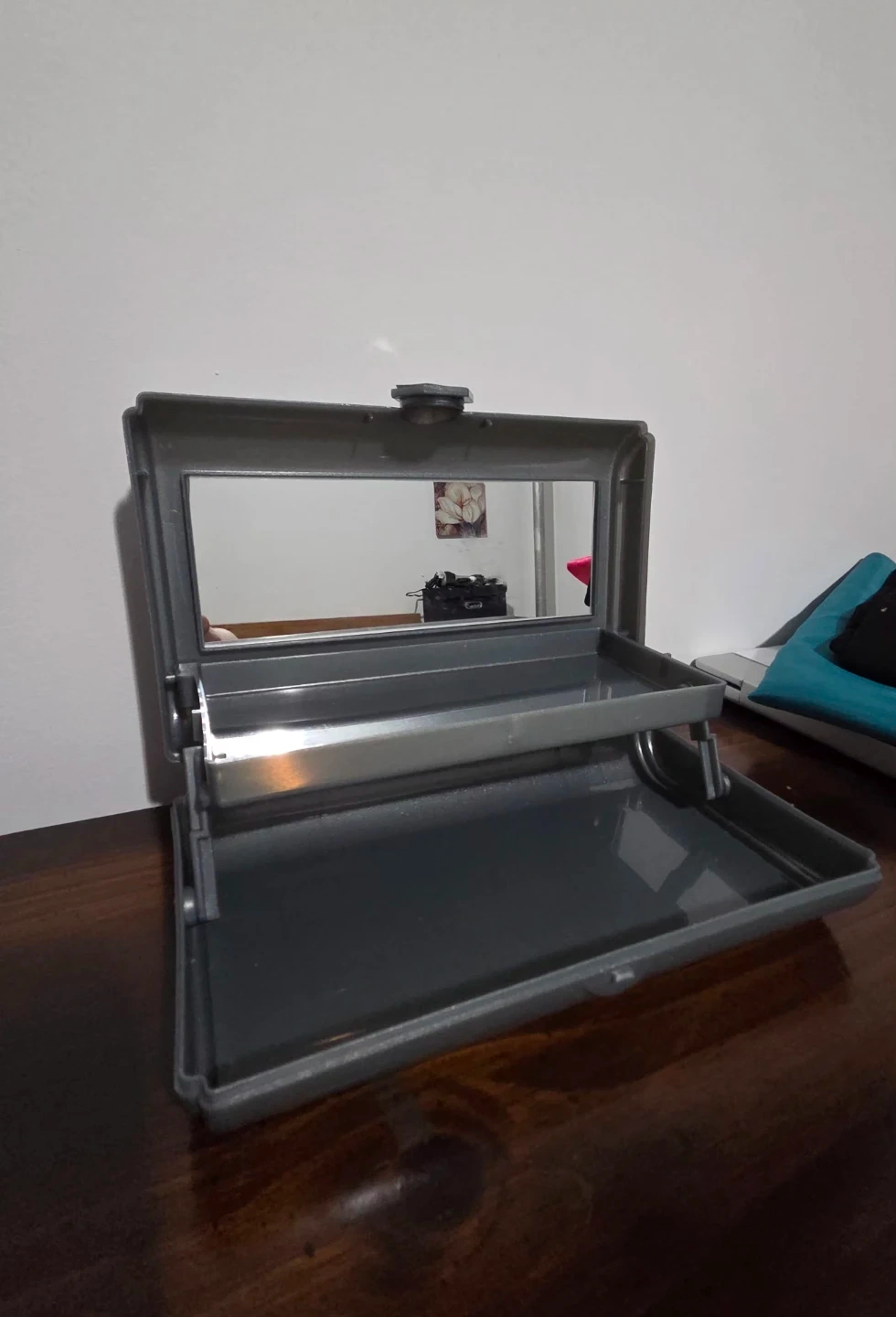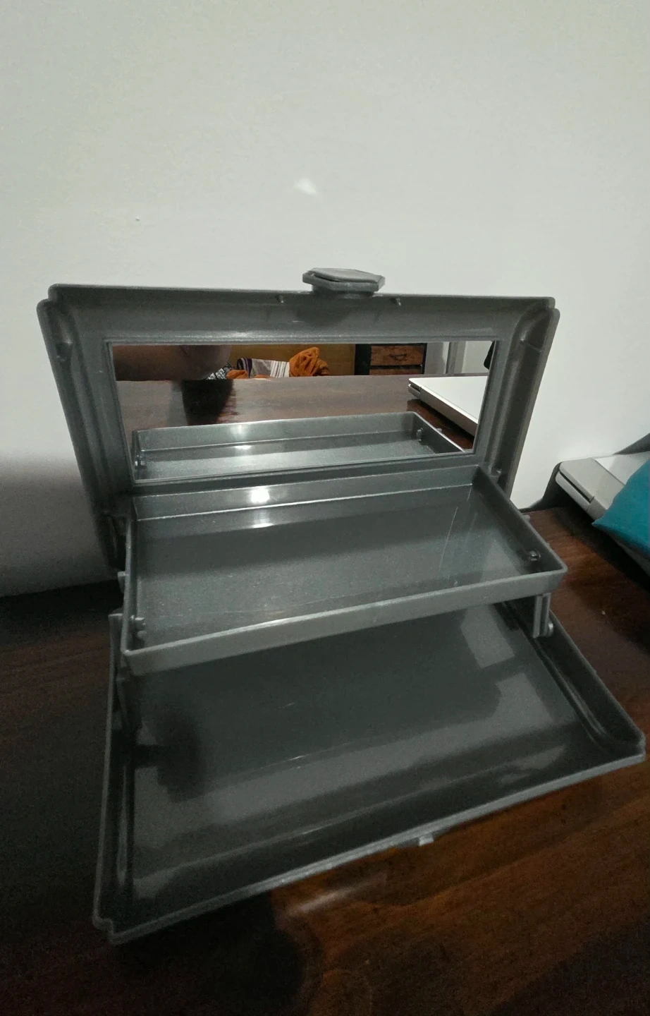 Compact gray plastic makeup case, perfect for travel or home use. Opens to reveal a small mirror and two tiered trays for organizing cosmetics or small accessories. Clean and in good condition.