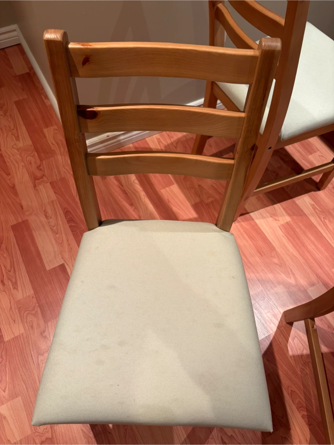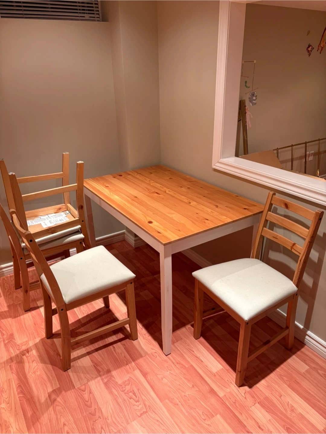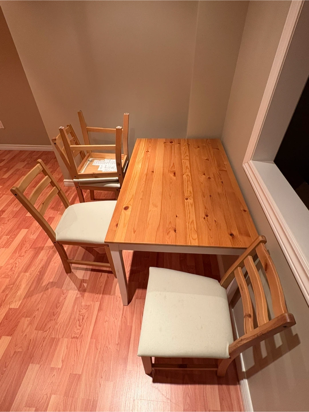Selling a used IKEA dining table with chairs. Perfect for a small space or starter home. The set includes a table and chairs, all in good condition. The table has a light wood top and white legs, while the chairs feature a natural wood frame with light-coloured seats. A great addition to any dining area!