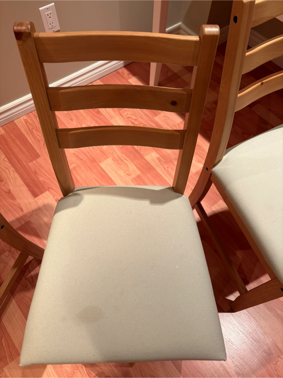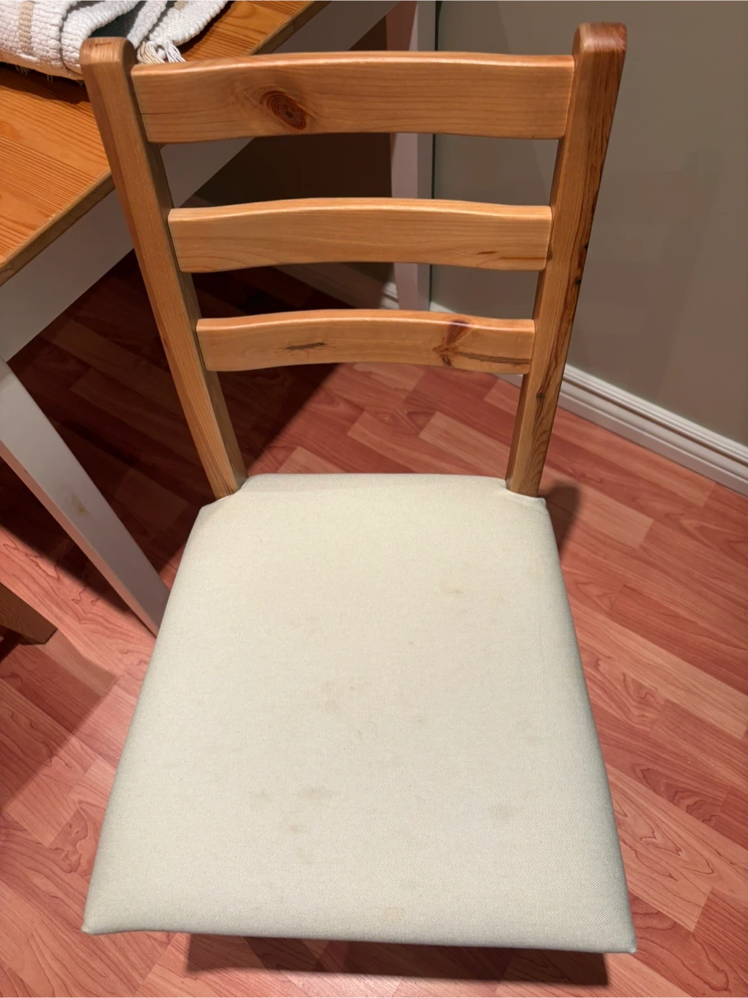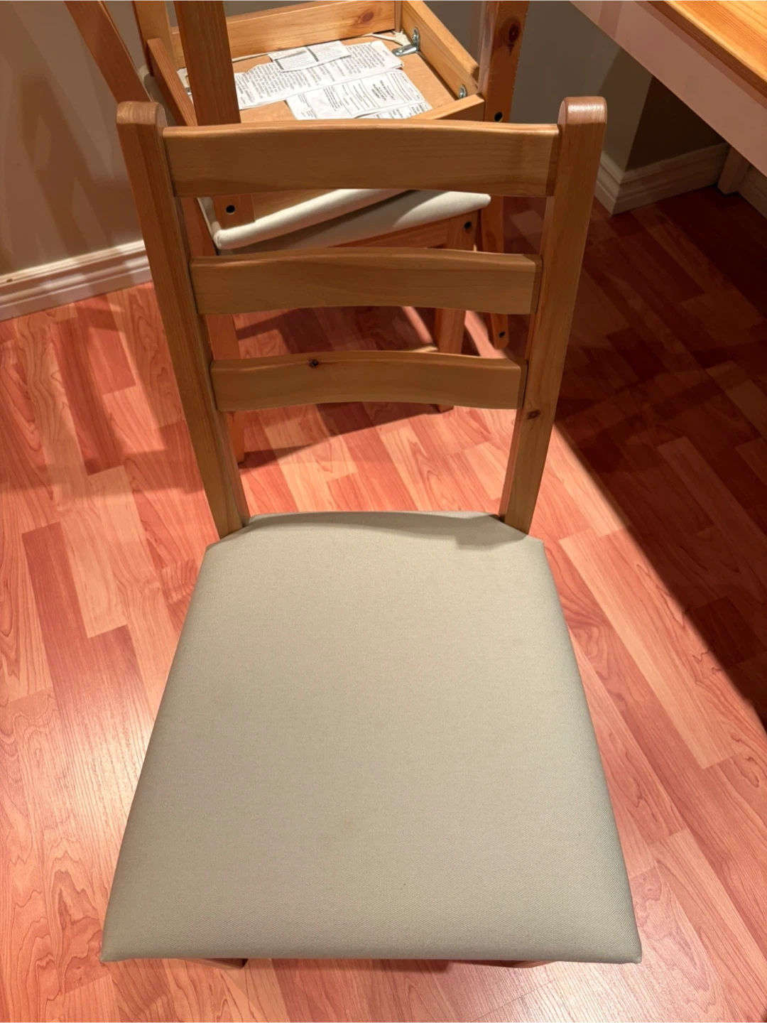 Selling a used IKEA dining table with chairs. Perfect for a small space or starter home. The set includes a table and chairs, all in good condition. The table has a light wood top and white legs, while the chairs feature a natural wood frame with light-coloured seats. A great addition to any dining area!