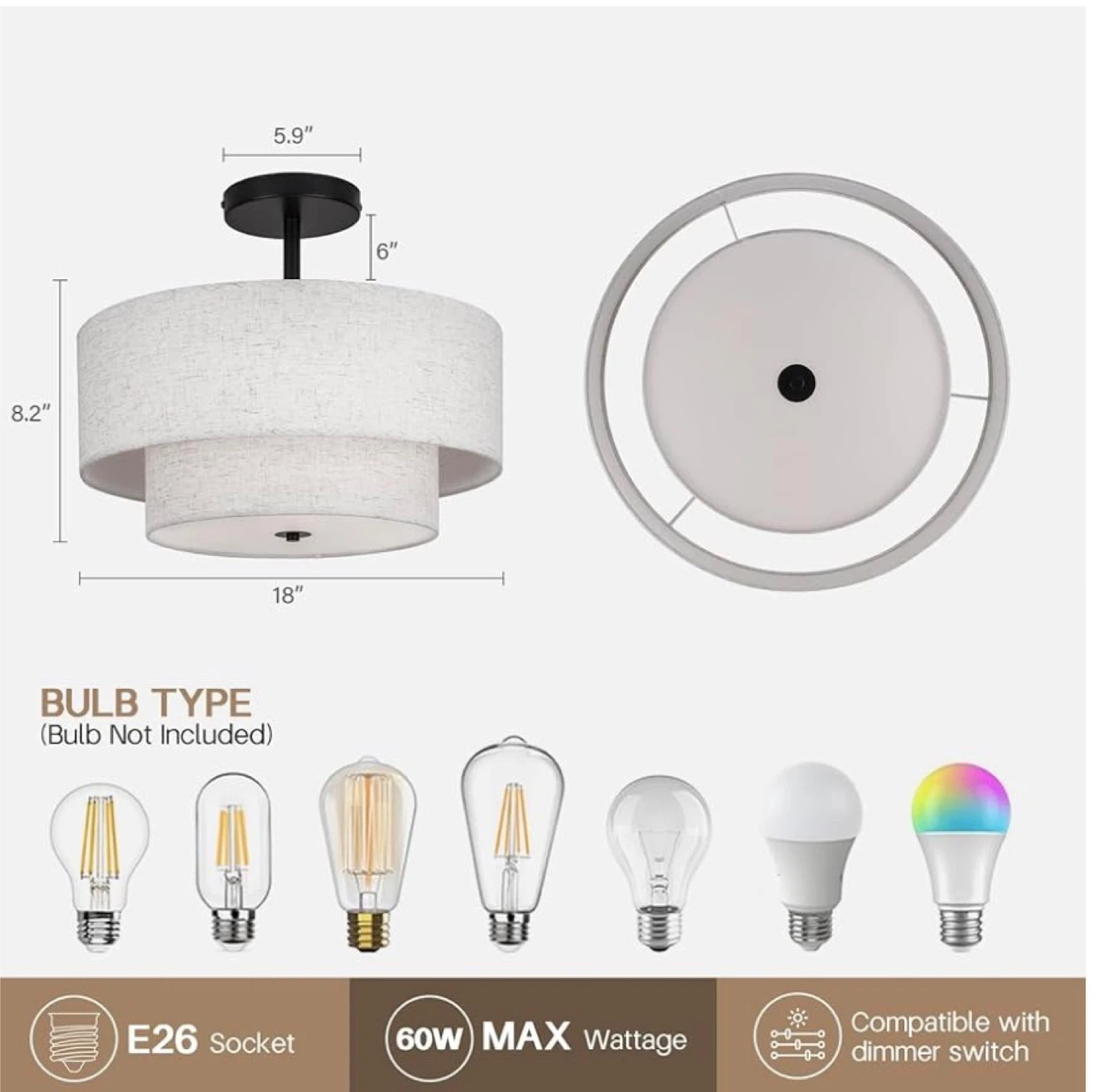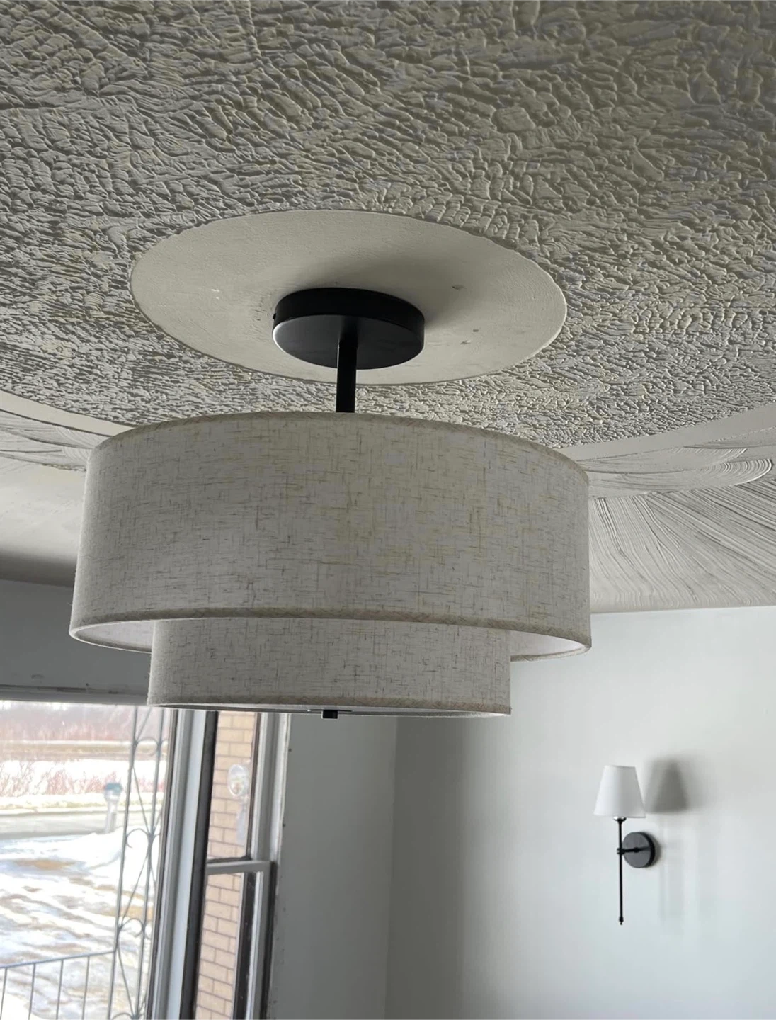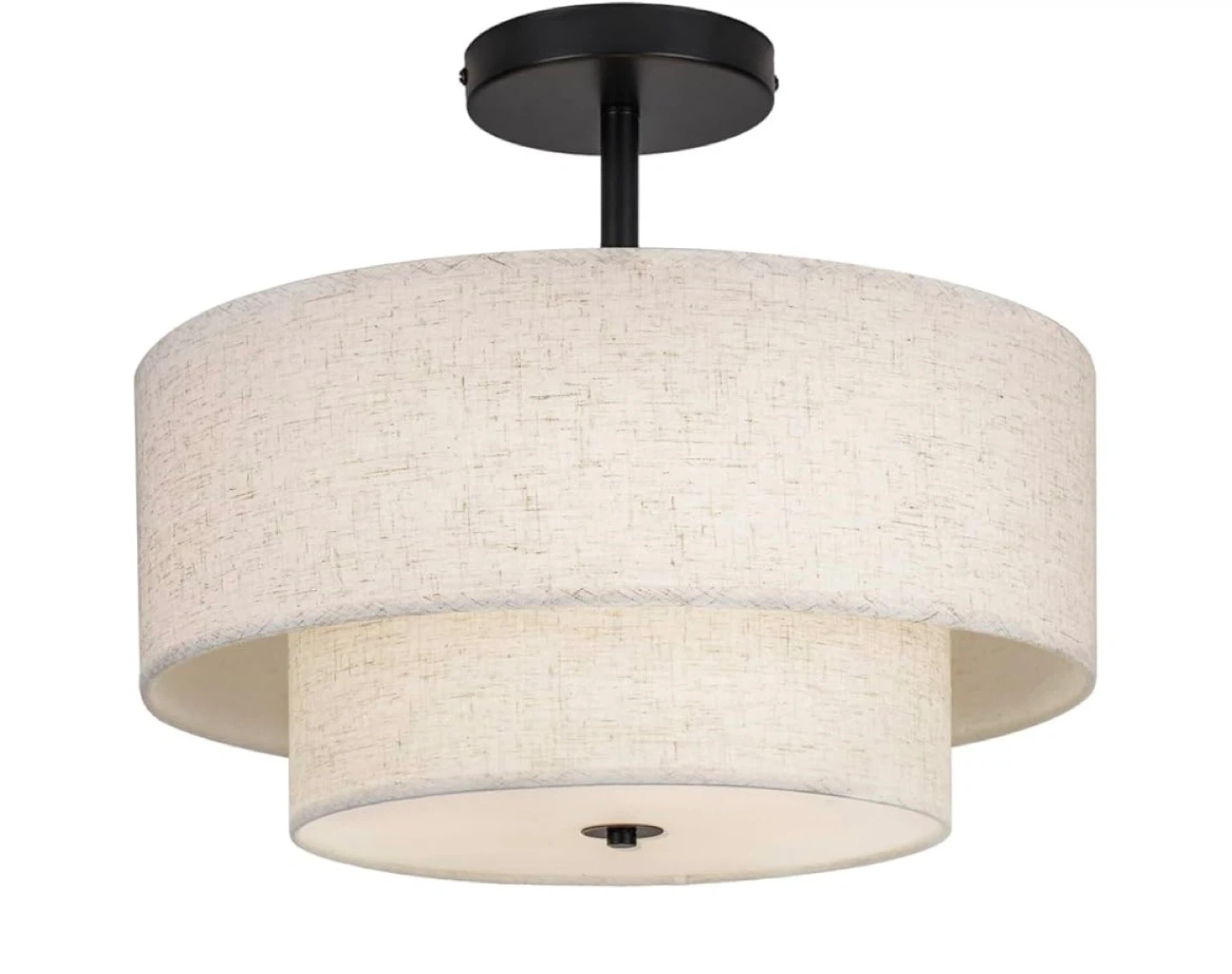 Add a touch of elegance to your space with this stylish drum shade flush mount ceiling light! It features a two-tiered design with a neutral-coloured fabric shade, perfect for adding a warm and inviting glow to any room.