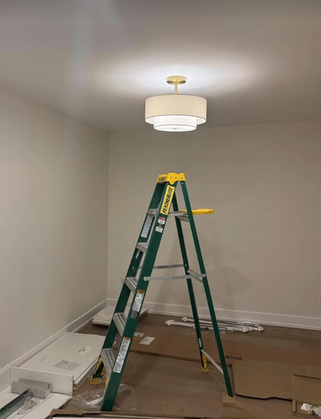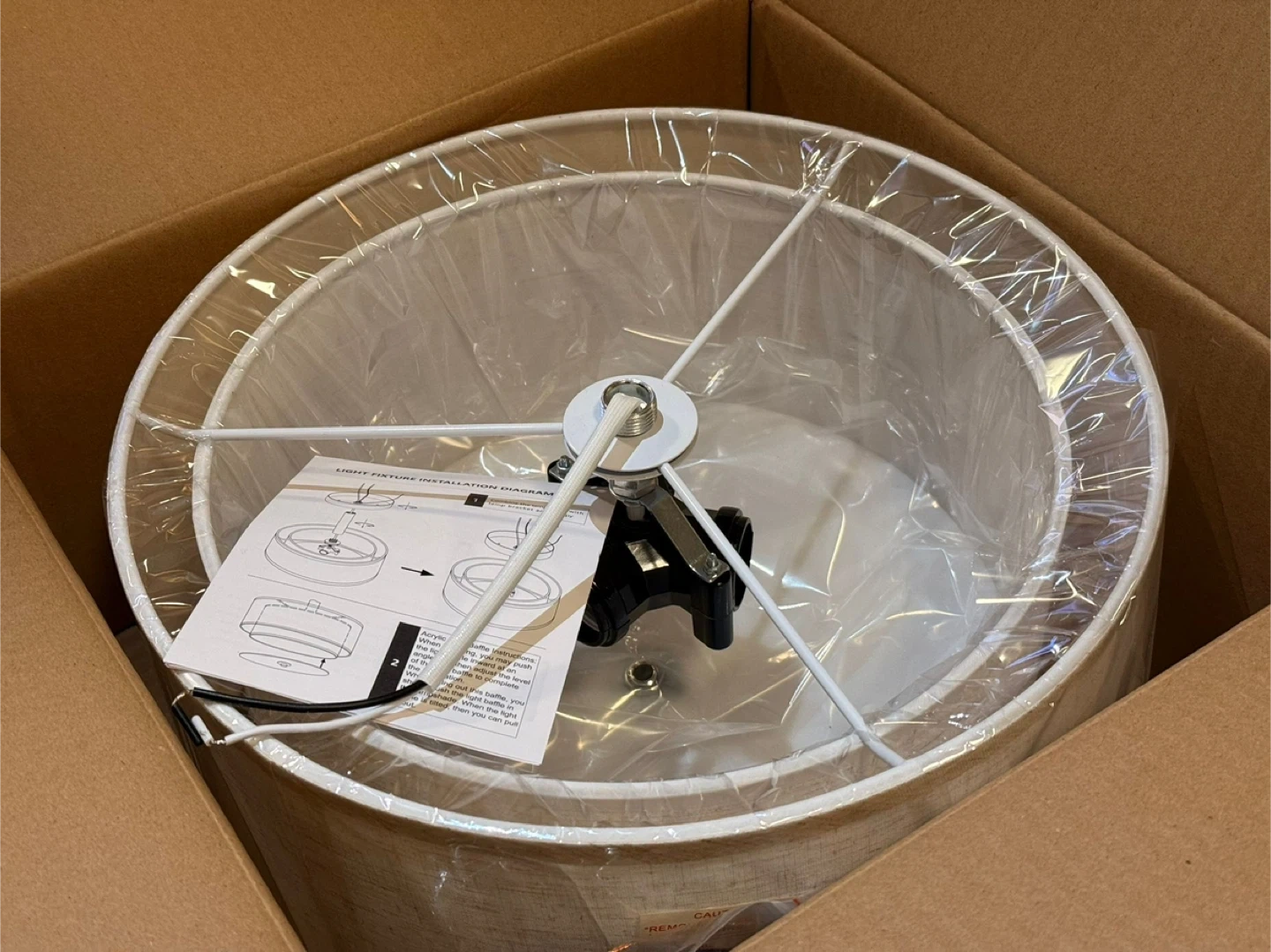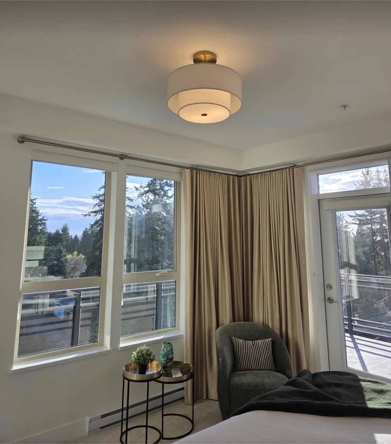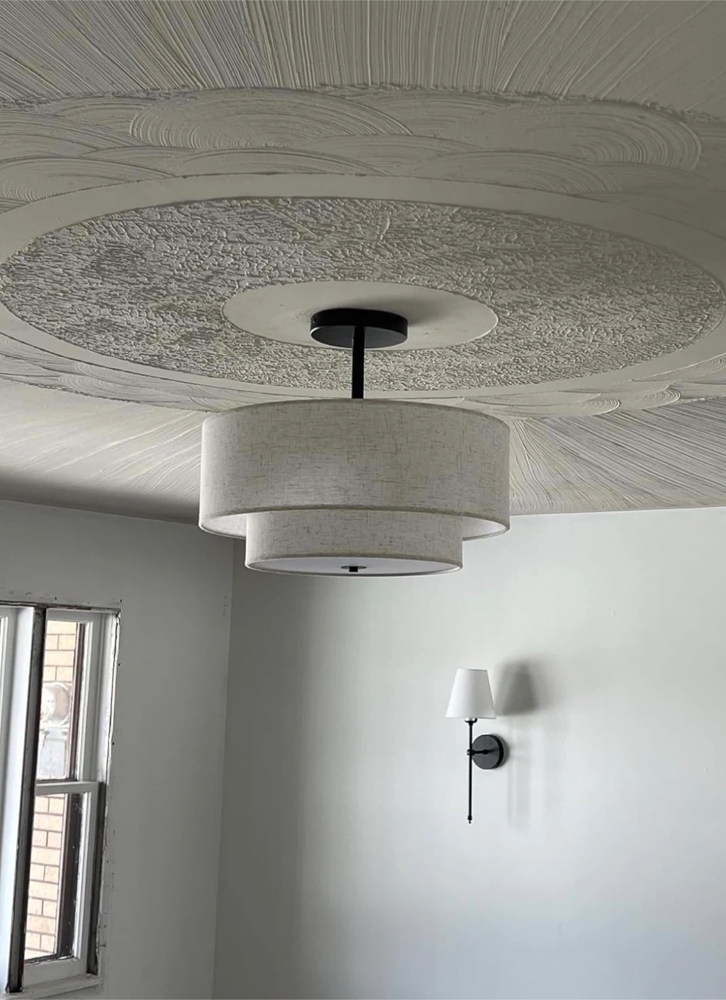 Add a touch of elegance to your space with this stylish drum shade flush mount ceiling light! It features a two-tiered design with a neutral-coloured fabric shade, perfect for adding a warm and inviting glow to any room.