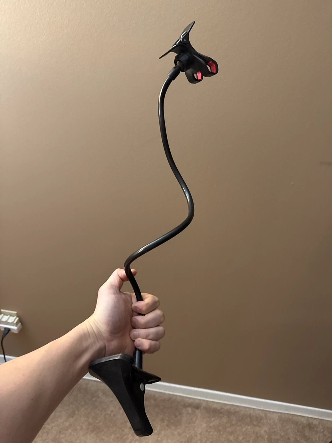 Selling a flexible long arm phone holder in black. It's perfect for holding your phone while you're watching videos or video chatting. It has a clamp to attach to a desk or other surface, making it easy to use anywhere