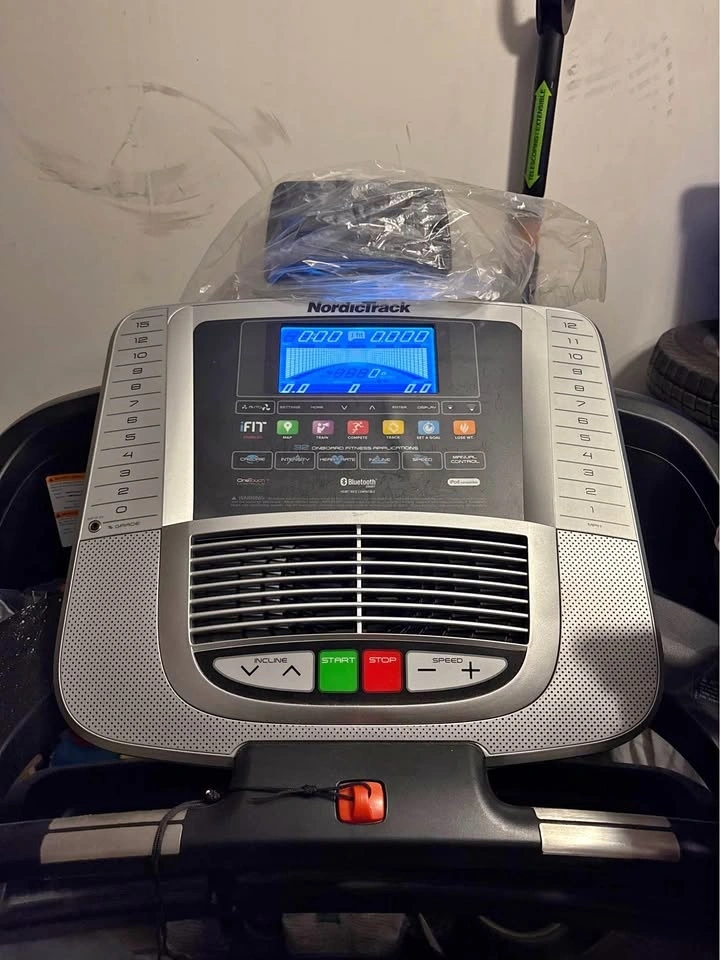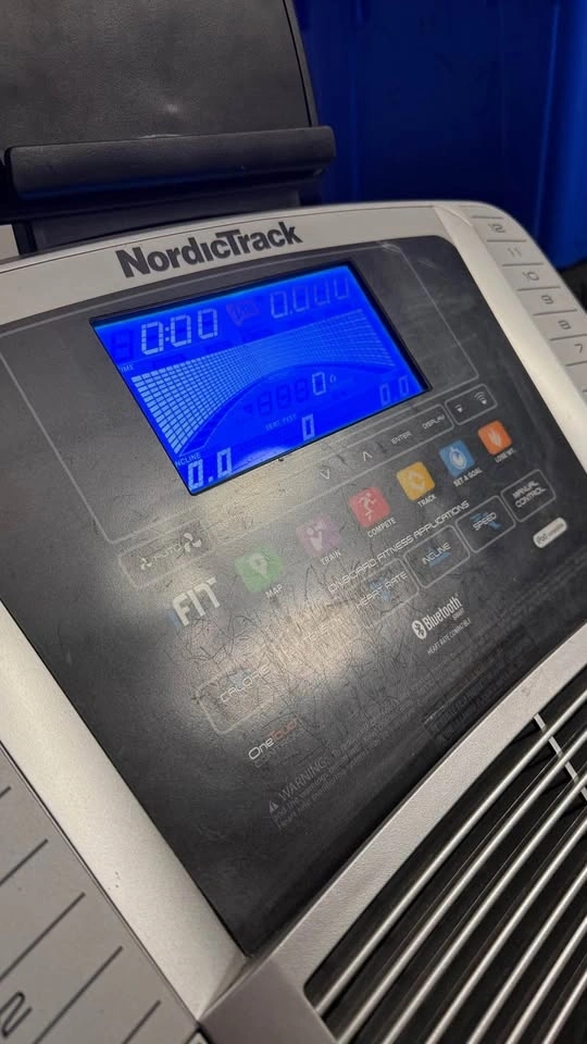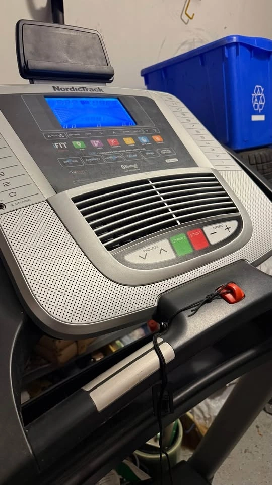 NordicTrack treadmill. It powers on (screen lights up), but the buttons are not responsive, so it needs repair.