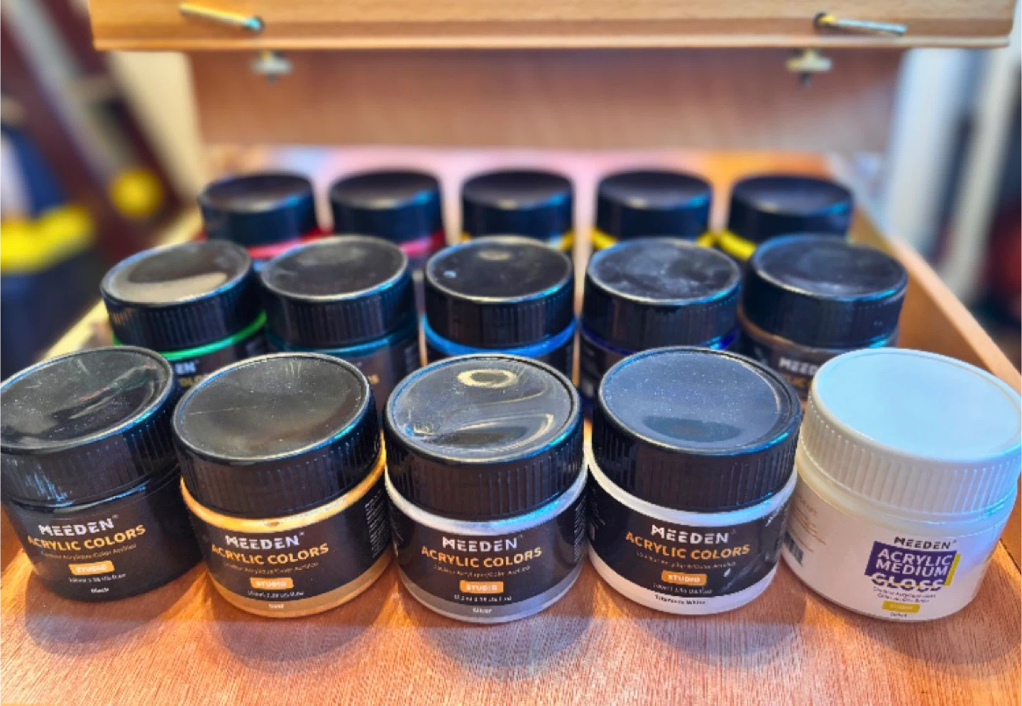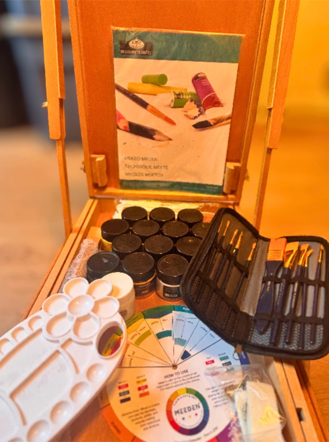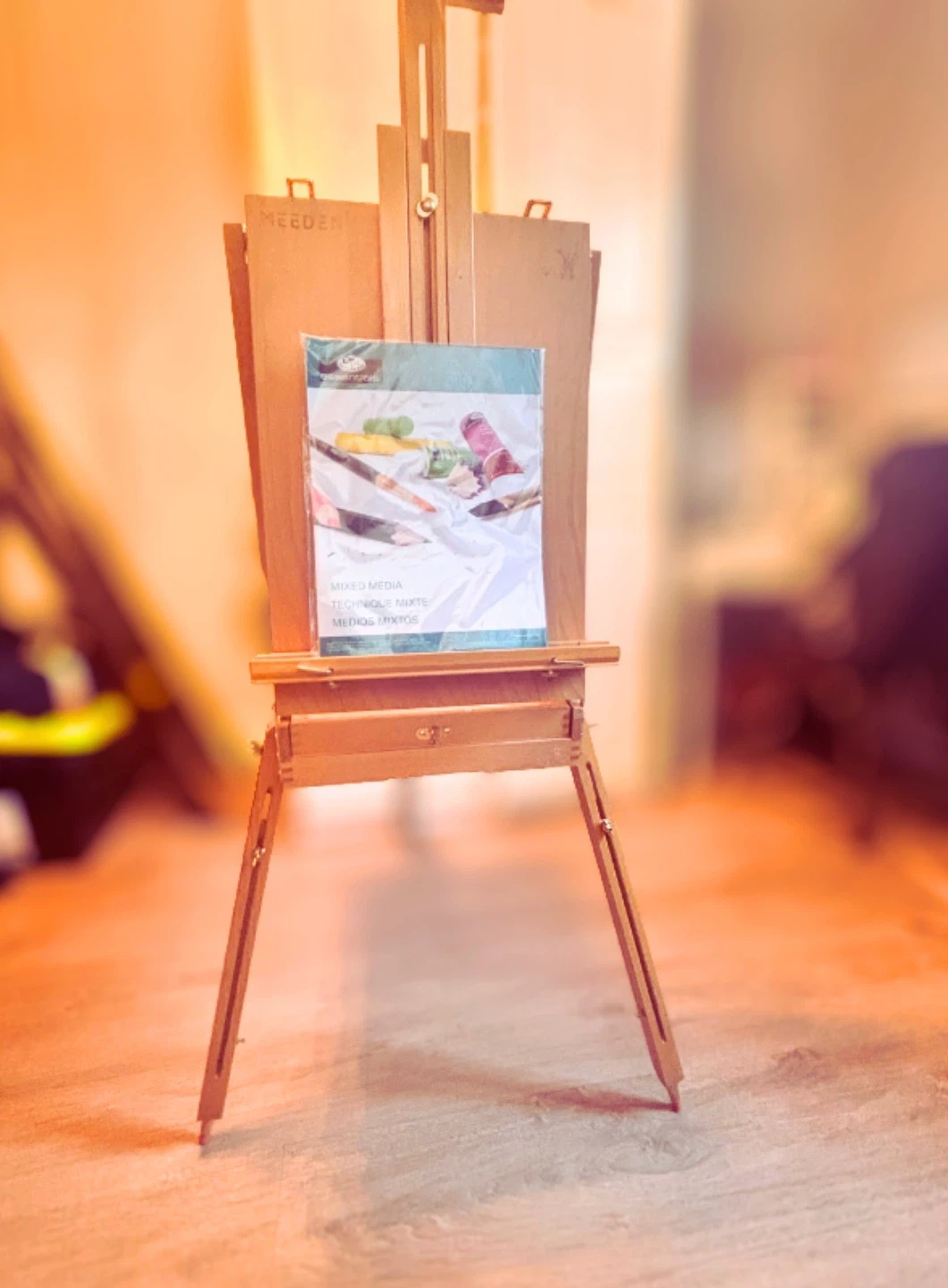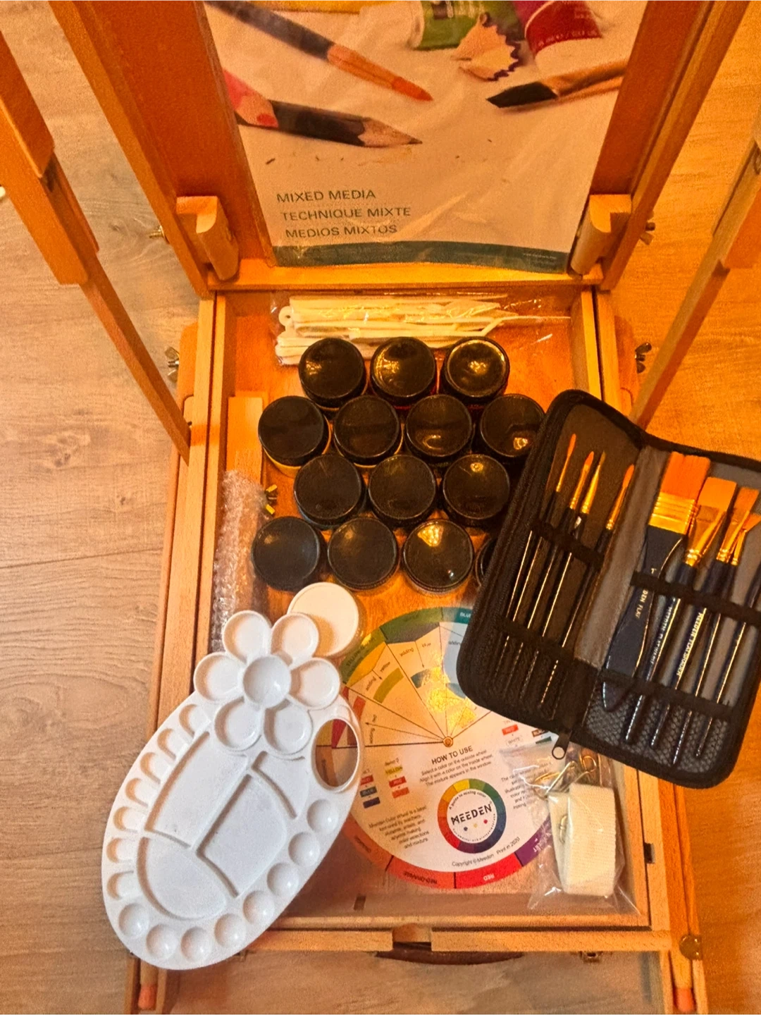Selling a Meeden easel, perfect for artists! It comes with a set of Meeden acrylic paints, brushes and a variety of other appliances. Great for anyone looking to start painting or expand their art supplies.