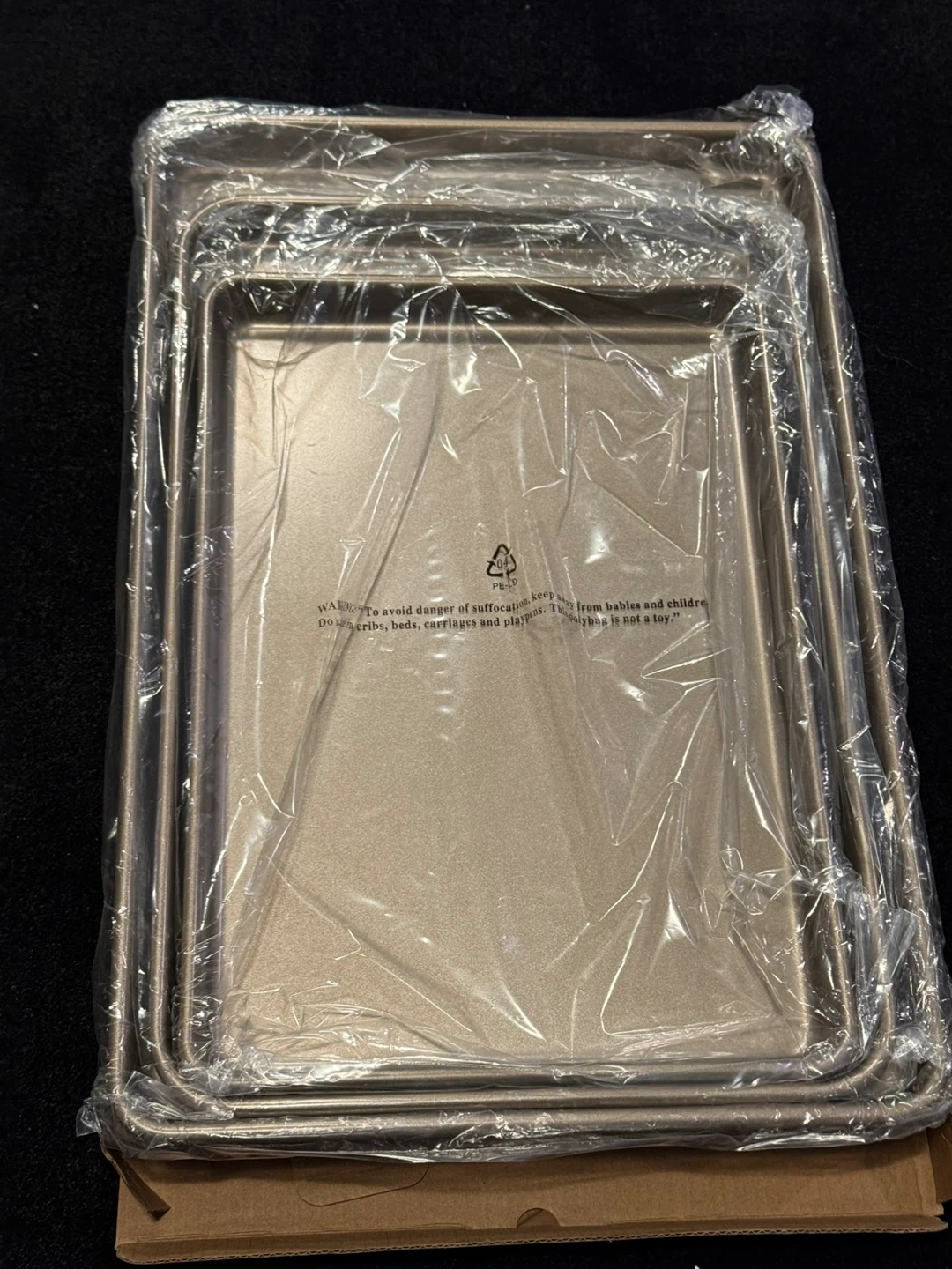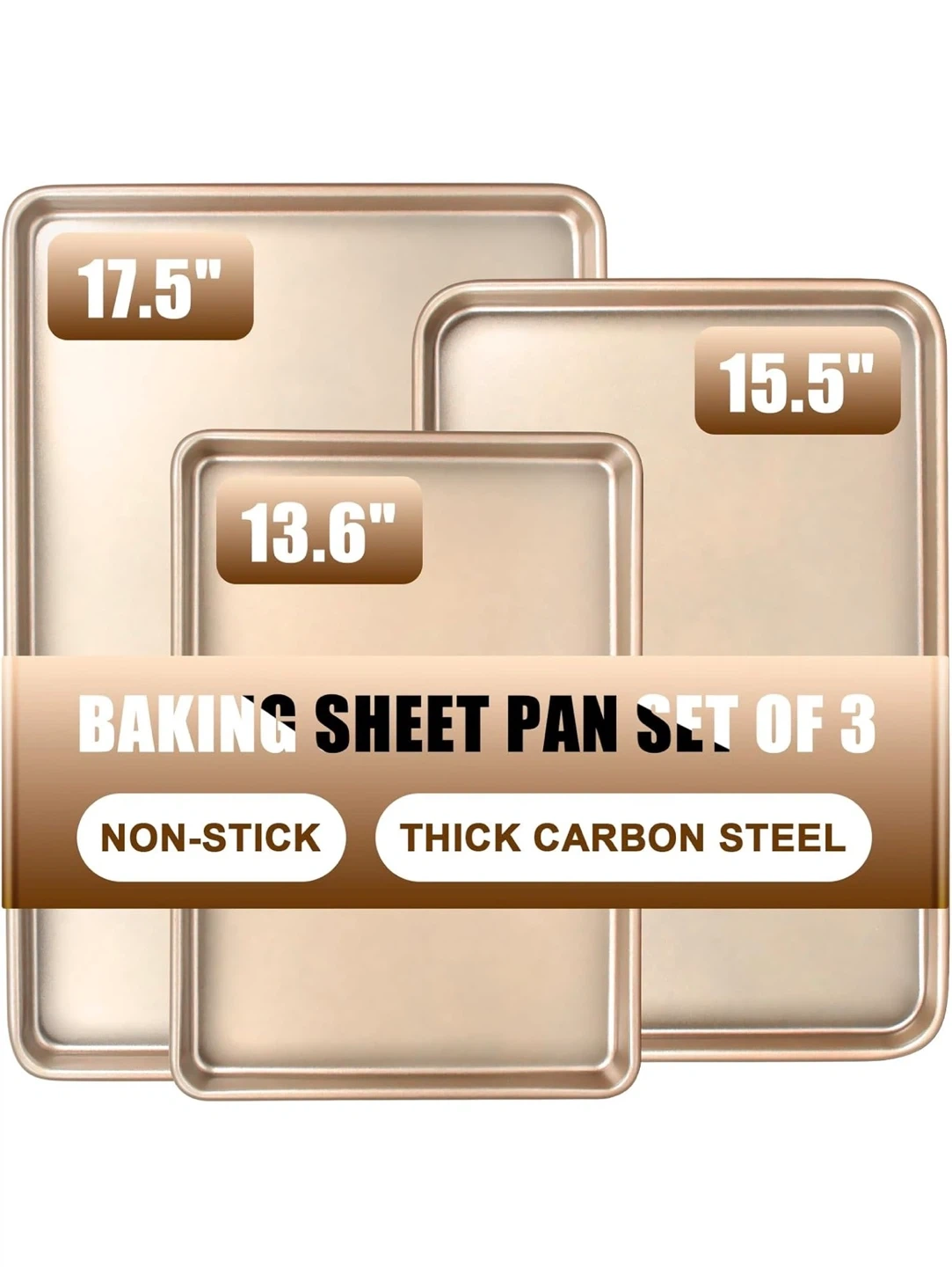 • Product Features: Includes three sizes of baking sheets: small, jelly roll, and half sheet. Features a premium nonstick coating, chemical-free, and fully rimmed border.