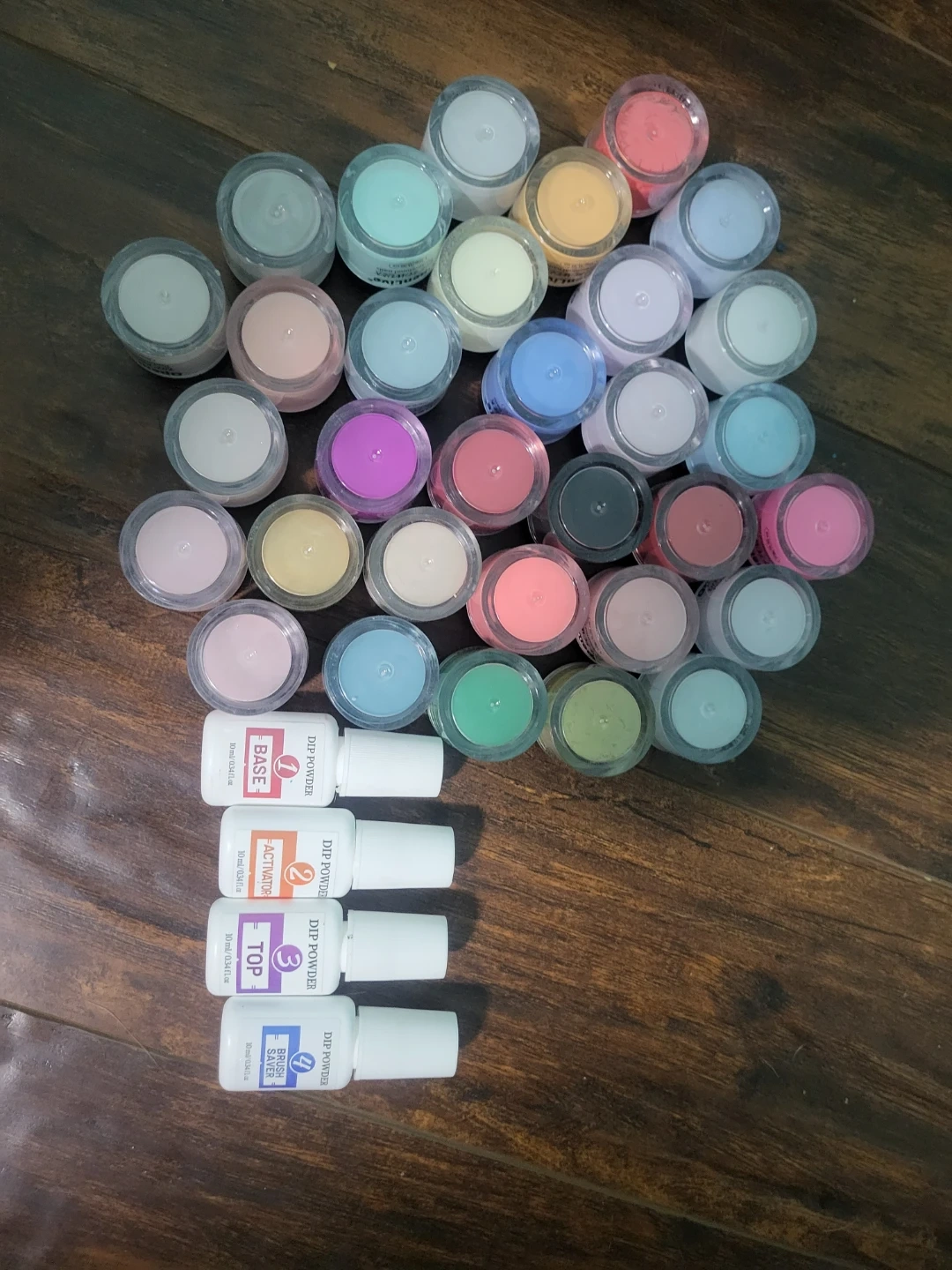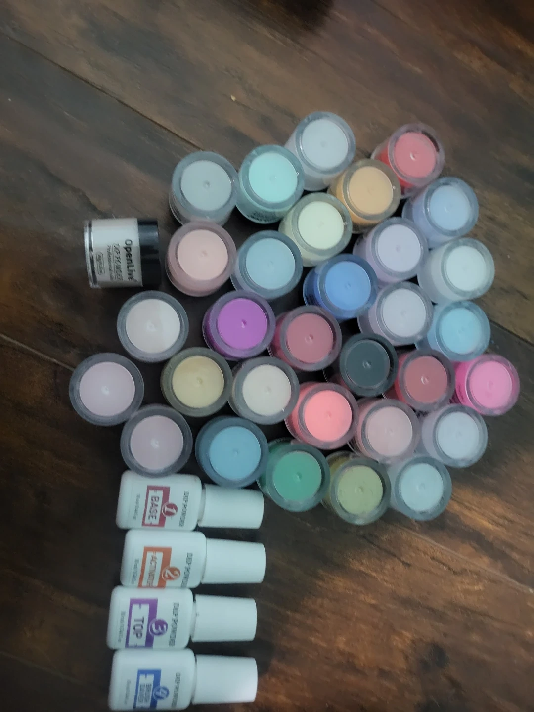 Selling a large set of Openline dip powder for nails! Includes a variety of colours and the base, activator, top coat, and brush saver liquids 32 pc