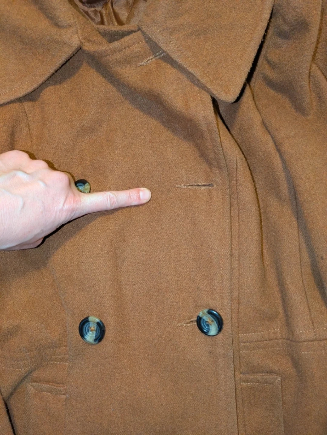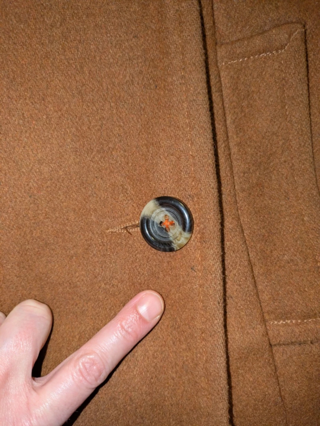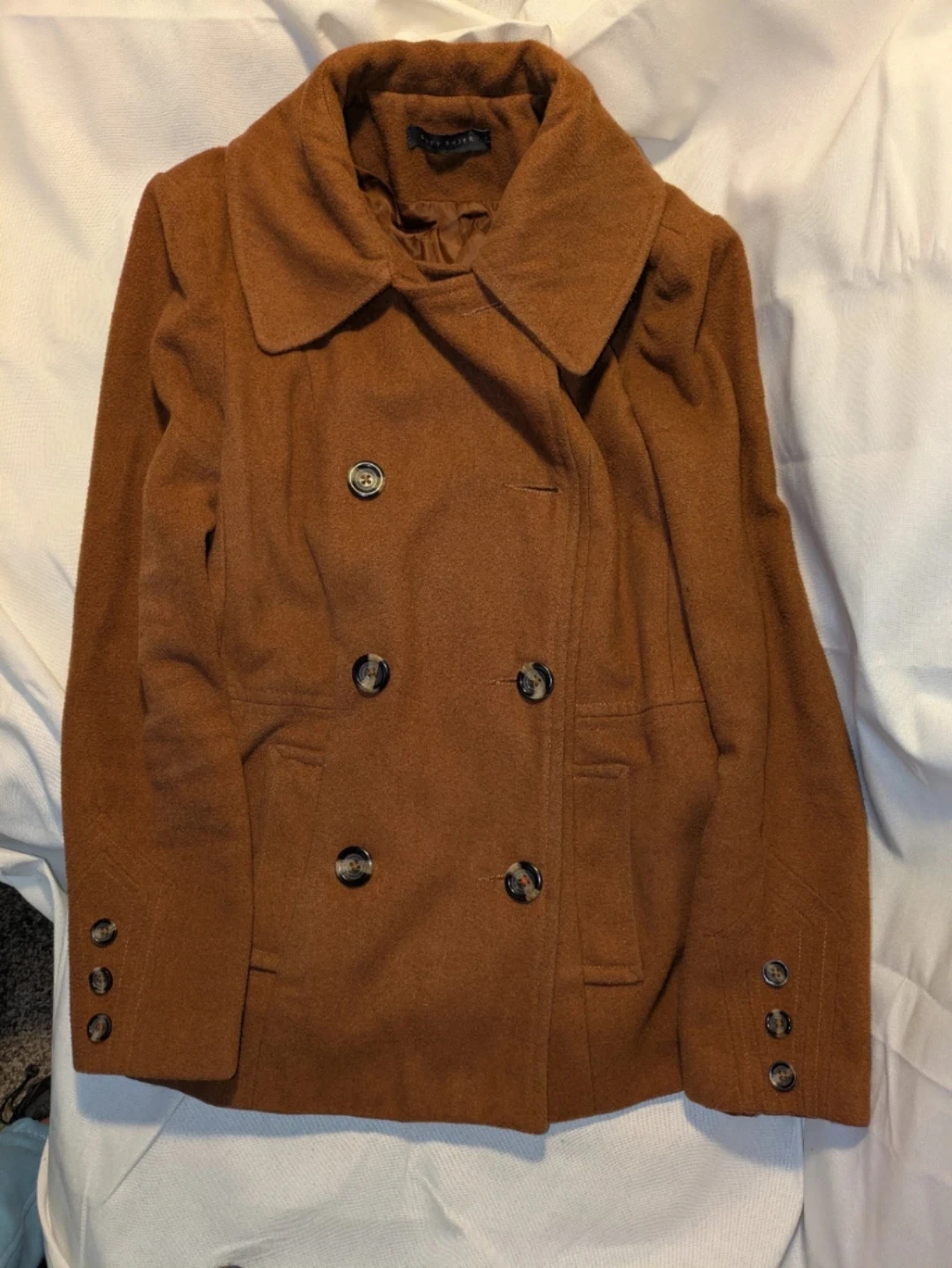 Well-loved rust coloured pea coat.