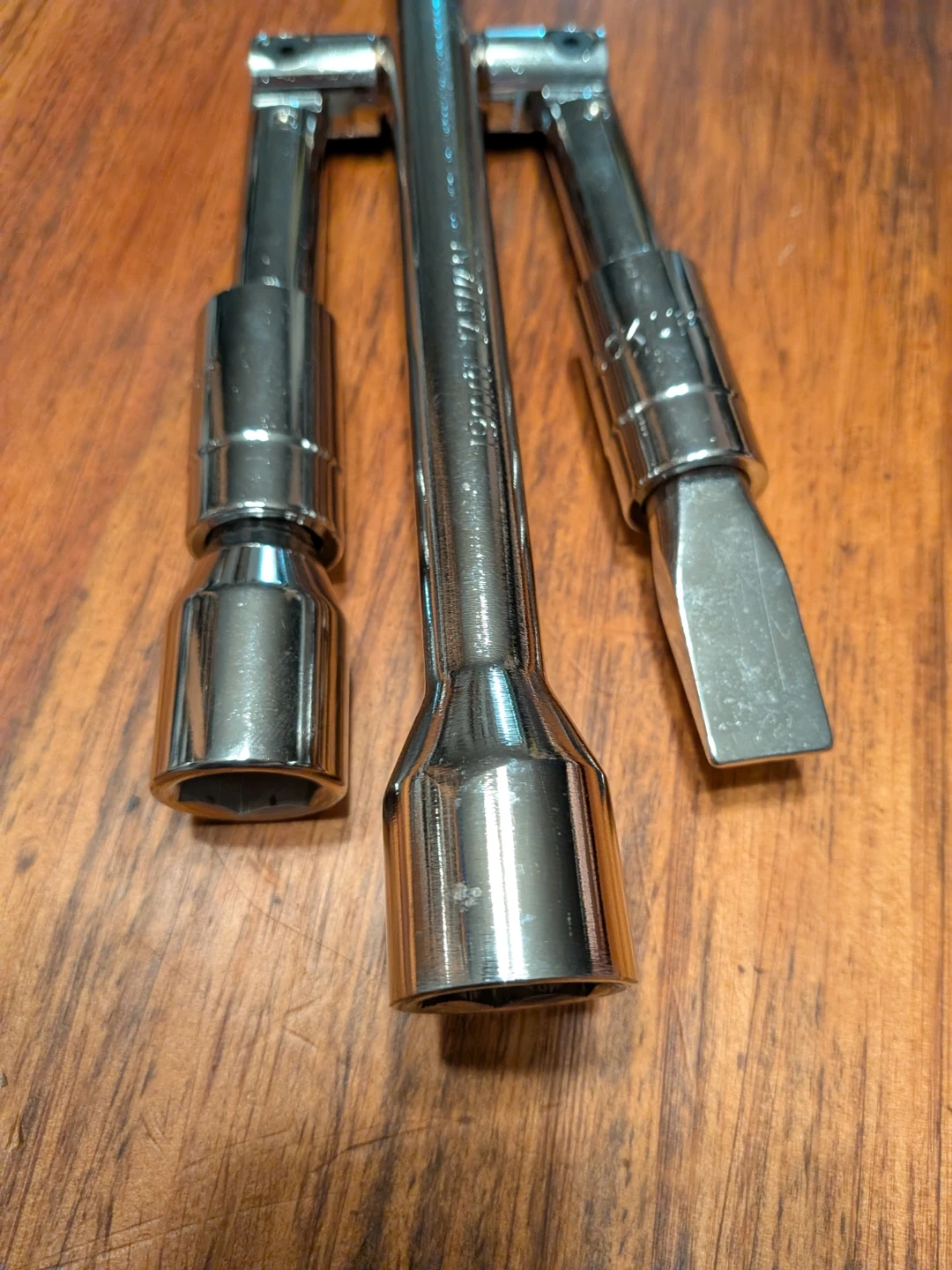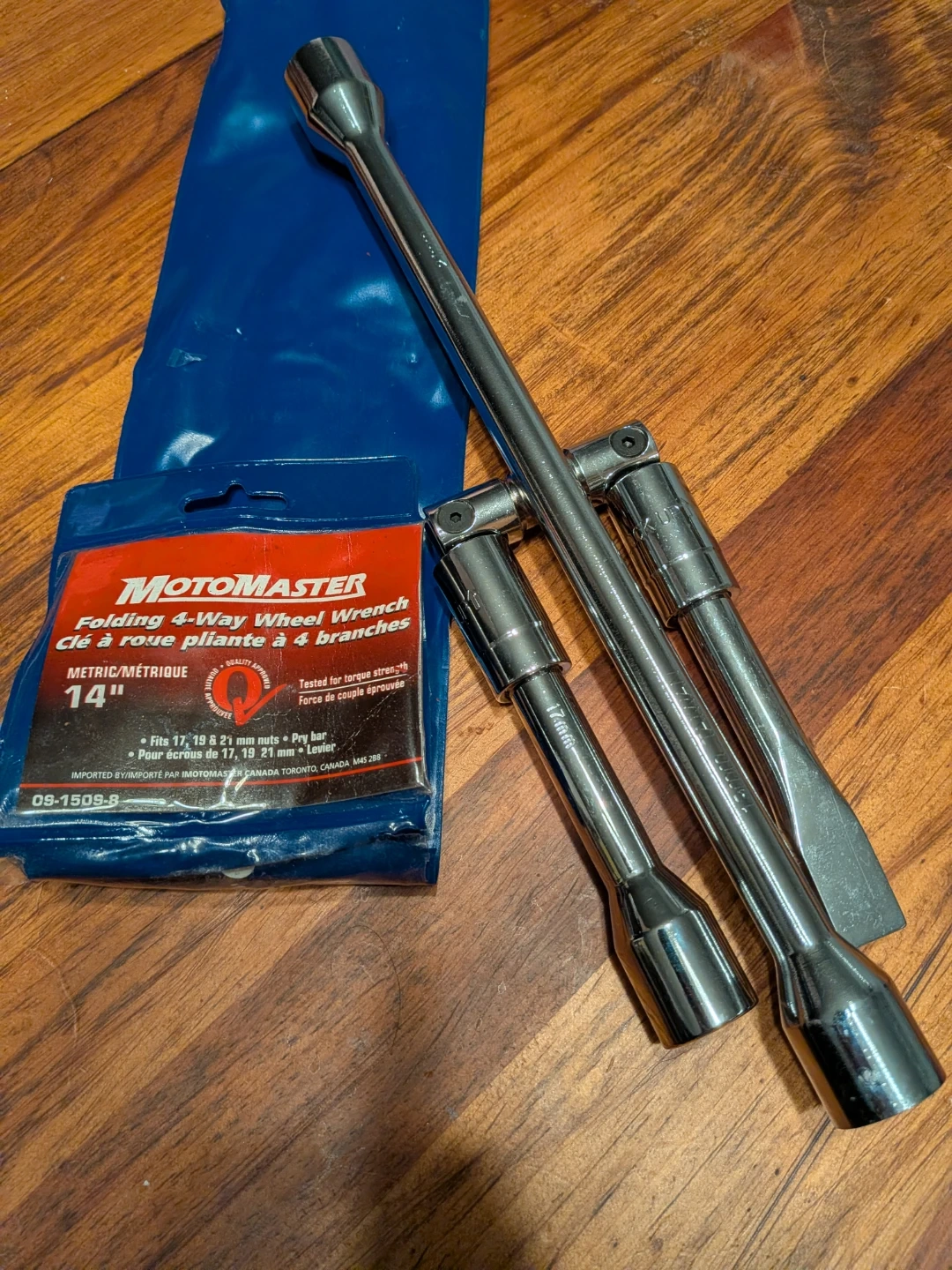 Selling a MotoMaster folding 4-way wheel wrench. It's a 14" wrench that fits 17, 19, and 21 mm nuts. Also works as a pry bar!
