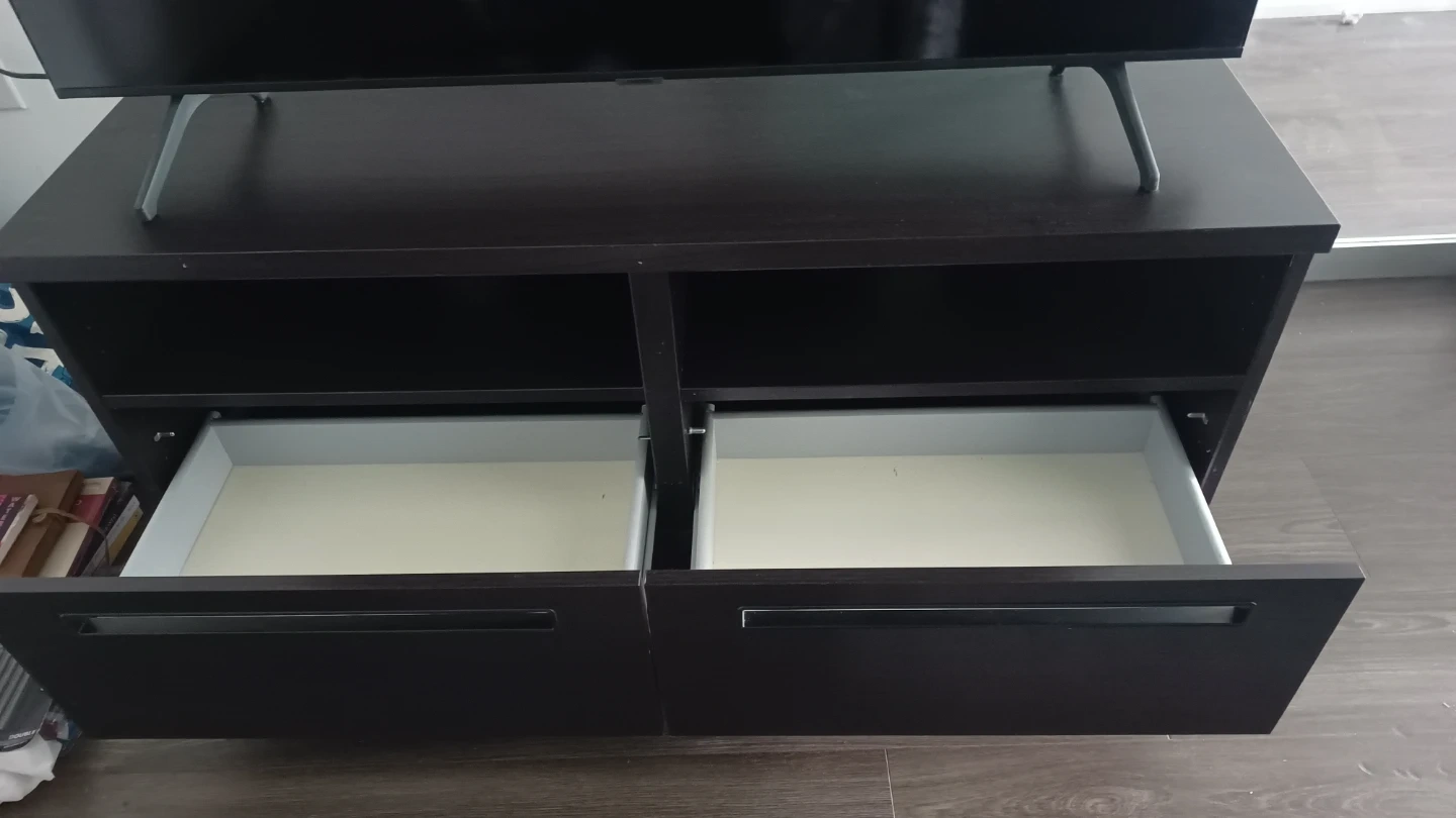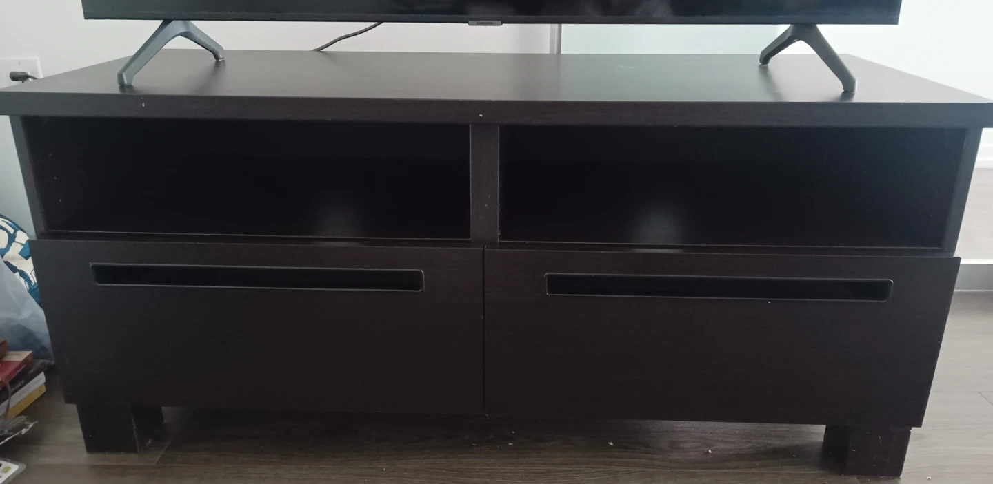 Selling a dark brown TV stand which has two drawers and open shelving for your media devices or decor. It's in great condition and can hold 50inches TV.