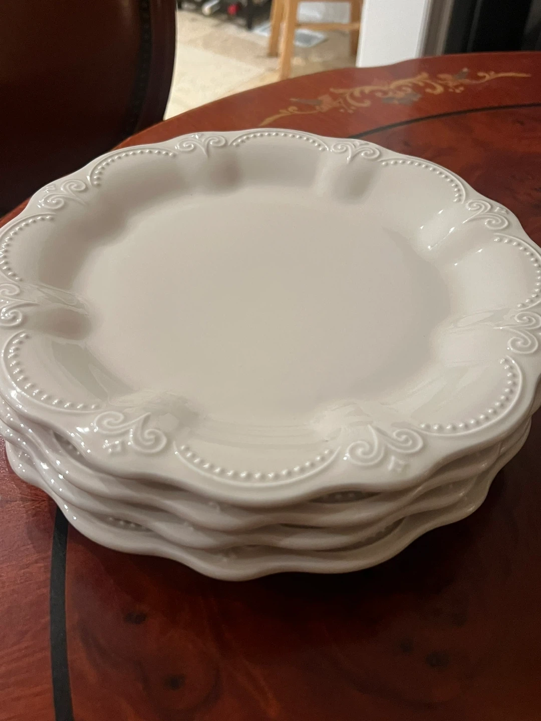 Selling a set of four decorative white plates. They're in great condition and would look lovely in any home. Perfect for adding a touch of elegance to your dining table!