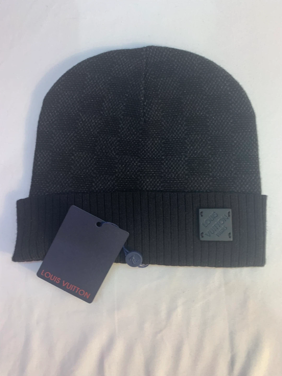 A stylish black beanie from Louis Vuitton to keep you warm during the colder months! The beanie has a subtle textured pattern and a ribbed brim. It features a Louis Vuitton logo patch on the front, adding a touch of luxury to your winter wardrobe