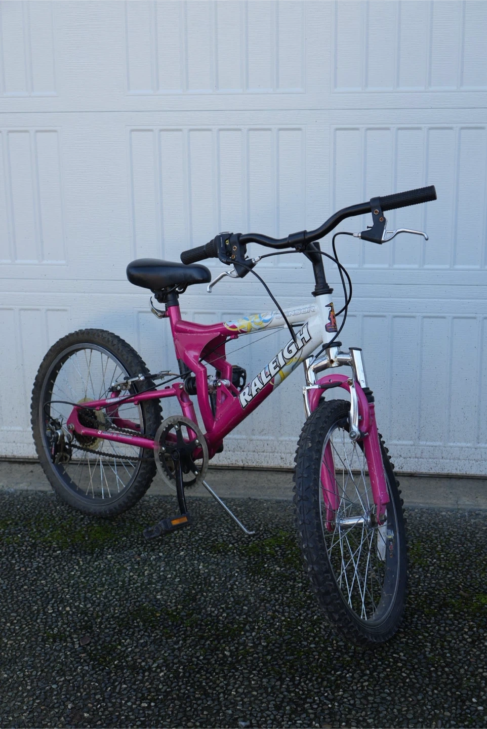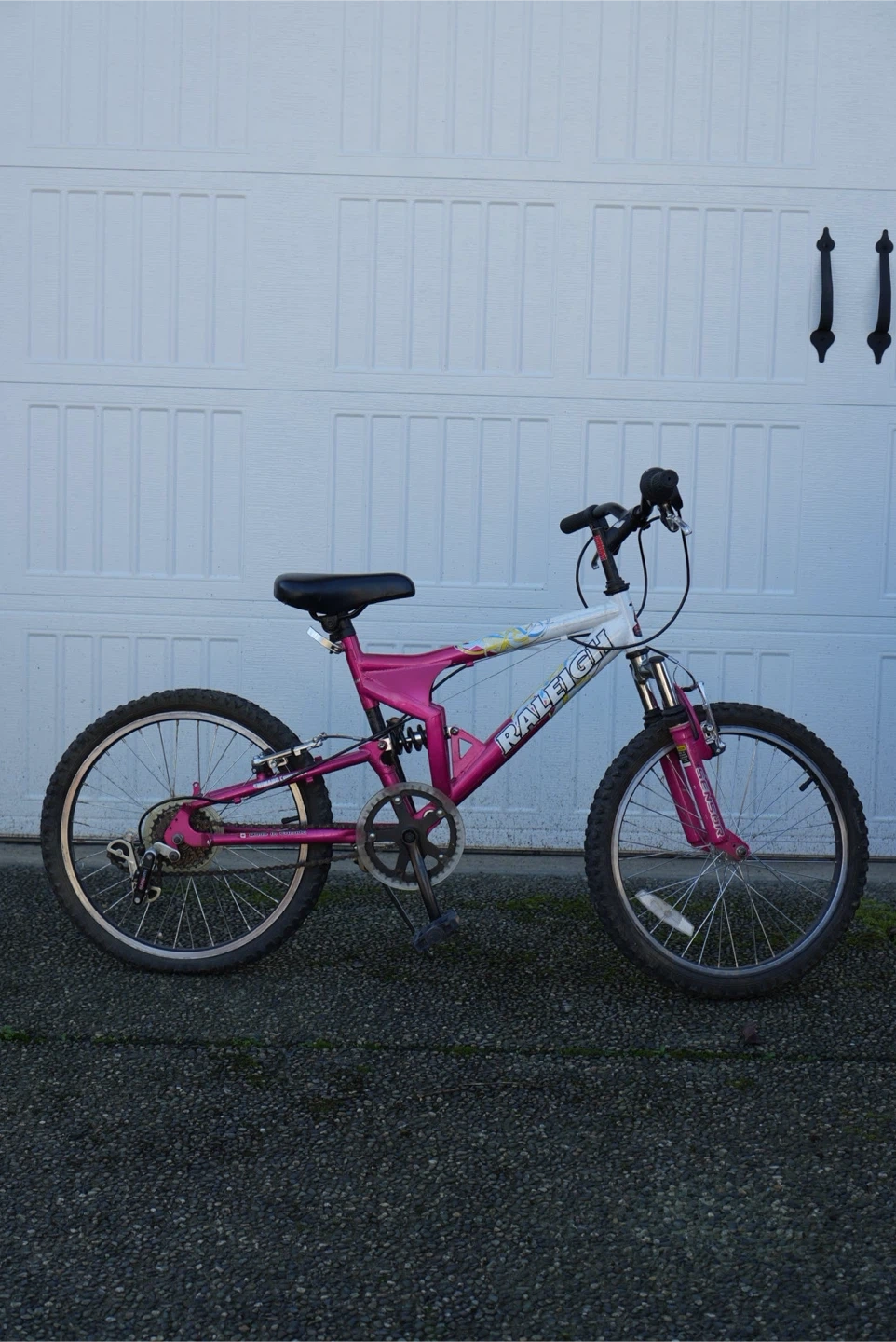 Selling a gently used Raleigh kids' mountain bike. It's pink and white and ready for a new rider to enjoy some outdoor adventures! Just needs some air put in tires.