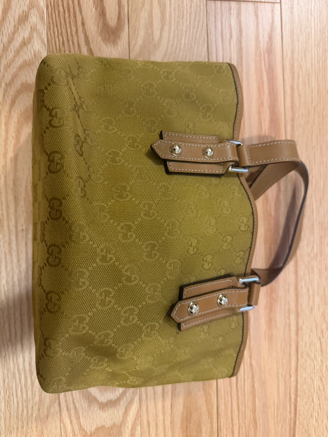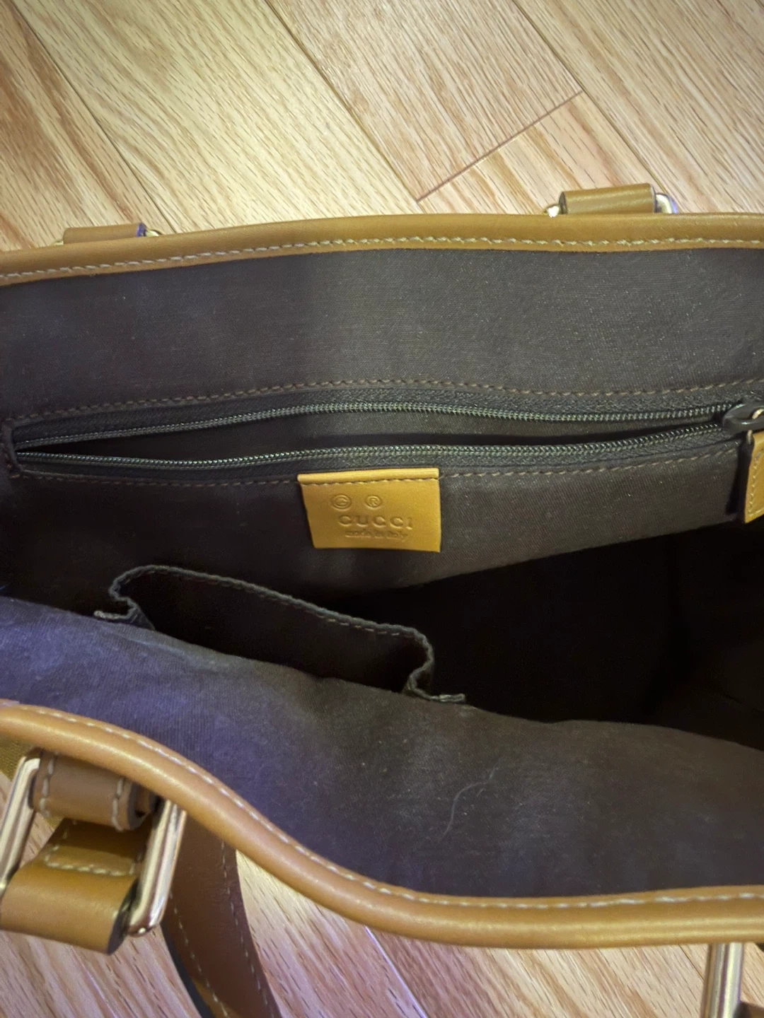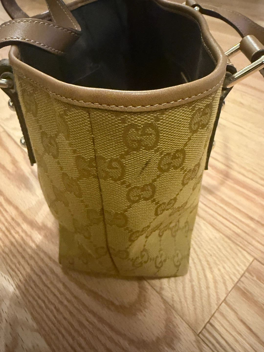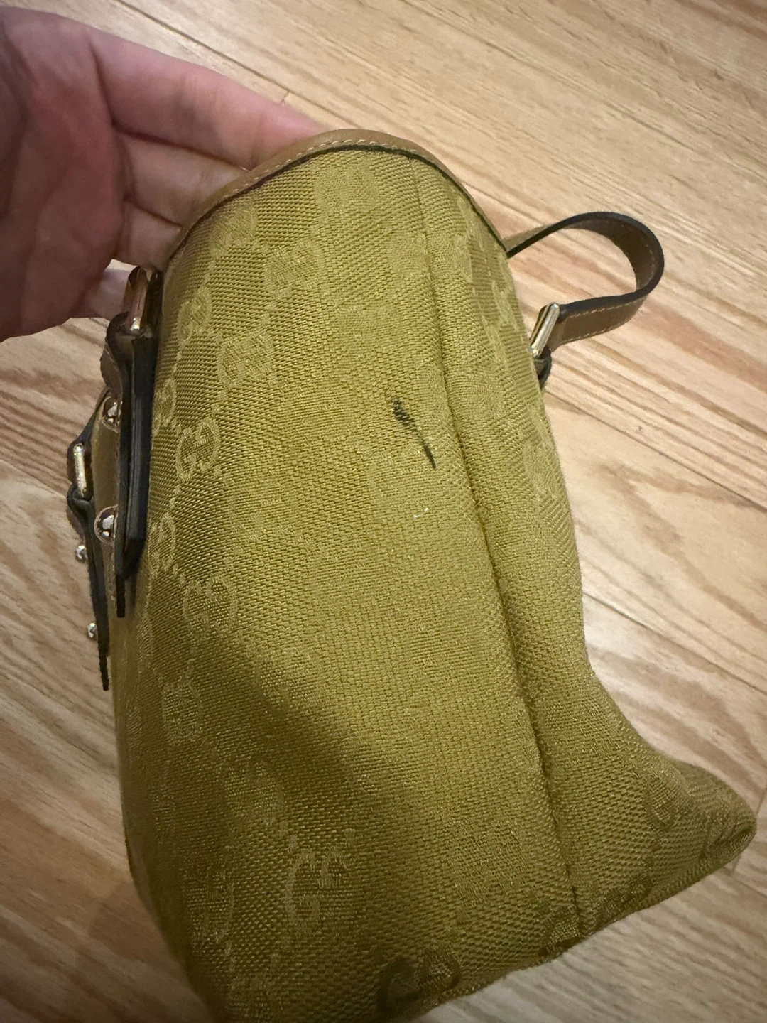 Selling a Gucci handbag. It has a distinctive Gucci pattern and leather trim. There's a small mark on the exterior, as shown in the photos, but otherwise it's in good condition.
