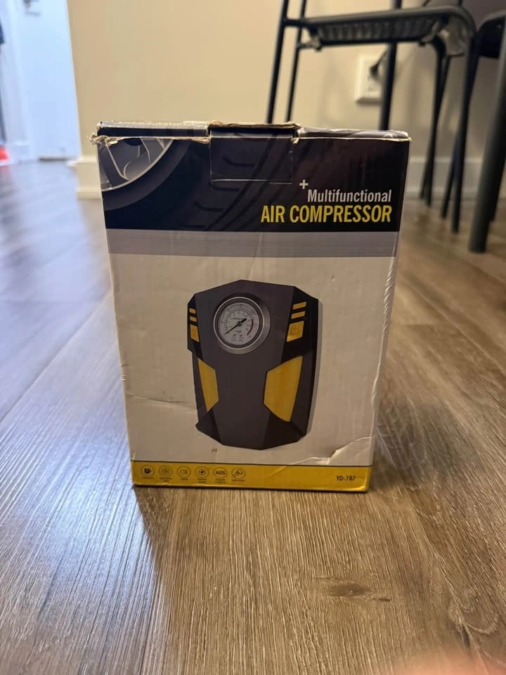 Barely used portable air compressor, perfect for topping up car tires, bikes, sports balls and more.
