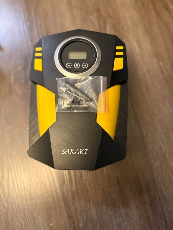 Works great, plugs into the 12V car outlet, easy to read pressure gauge.