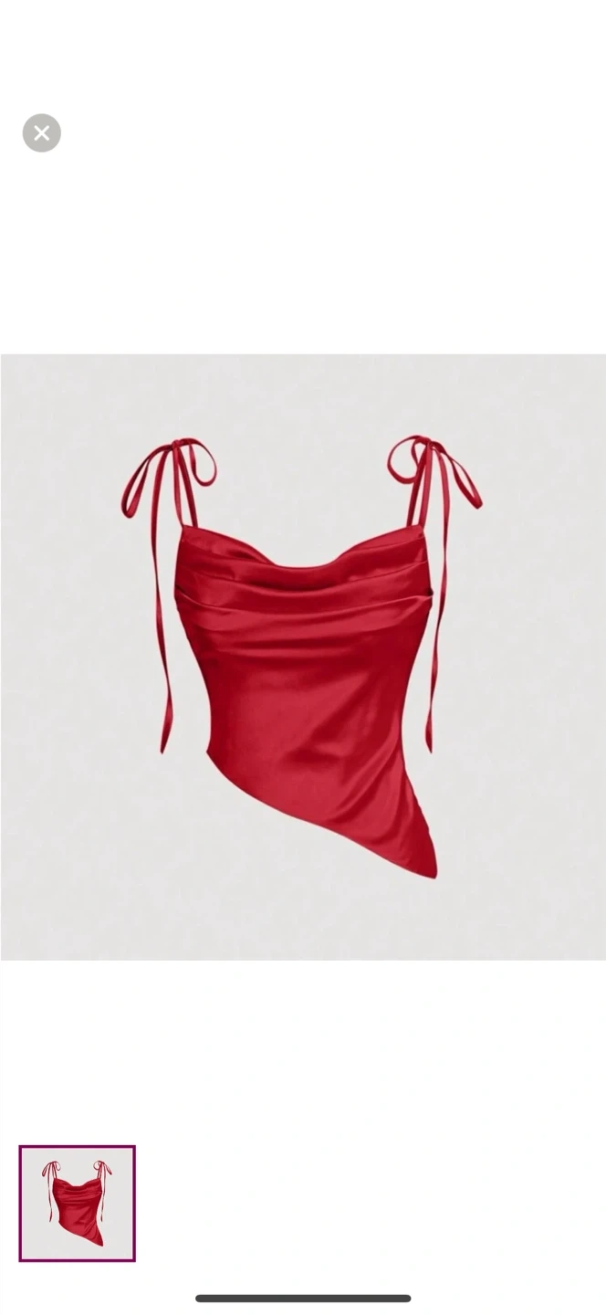 A stylish red satin cowl neck top! It features tie straps and an asymmetrical hem. Perfect for a night out or a special occasion
