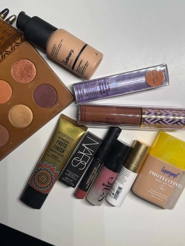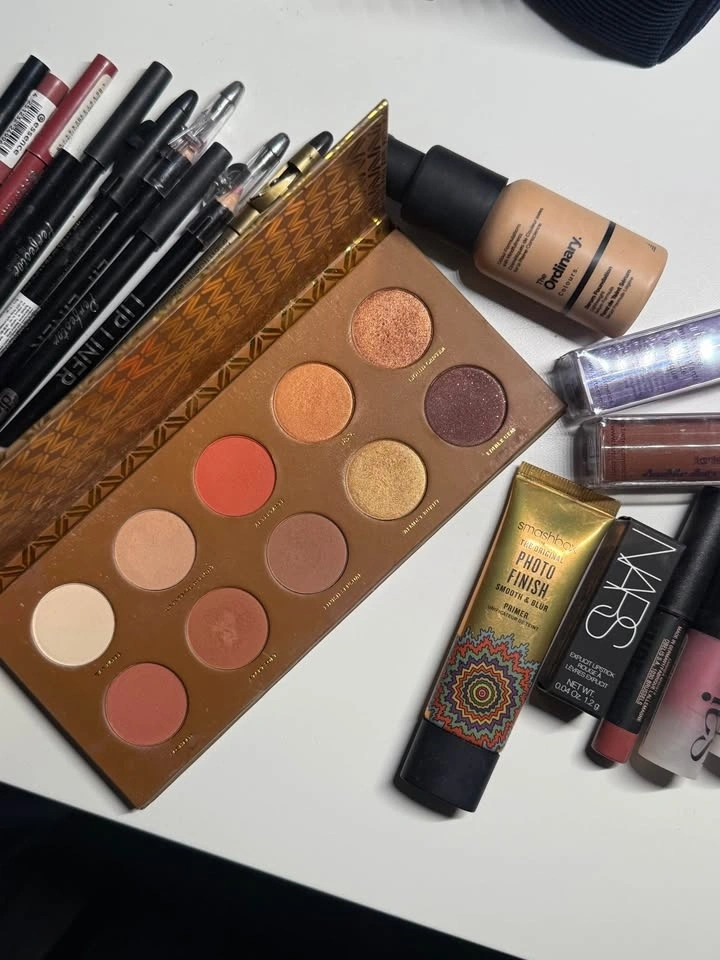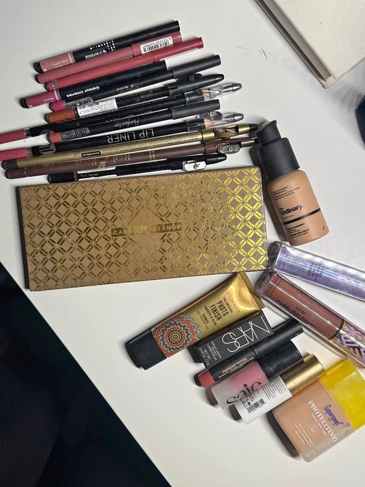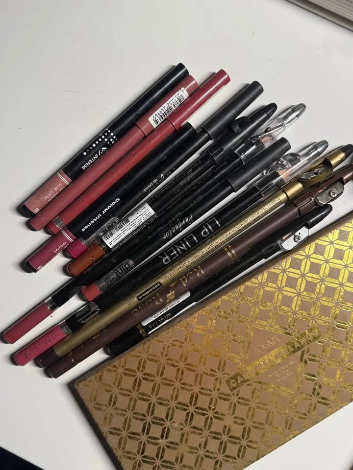 Bunch of new and gently used makeup items. Eyeshadow palette from Zoeva, many lip and eye pencils, foundations, blush, new Nars lipstick.