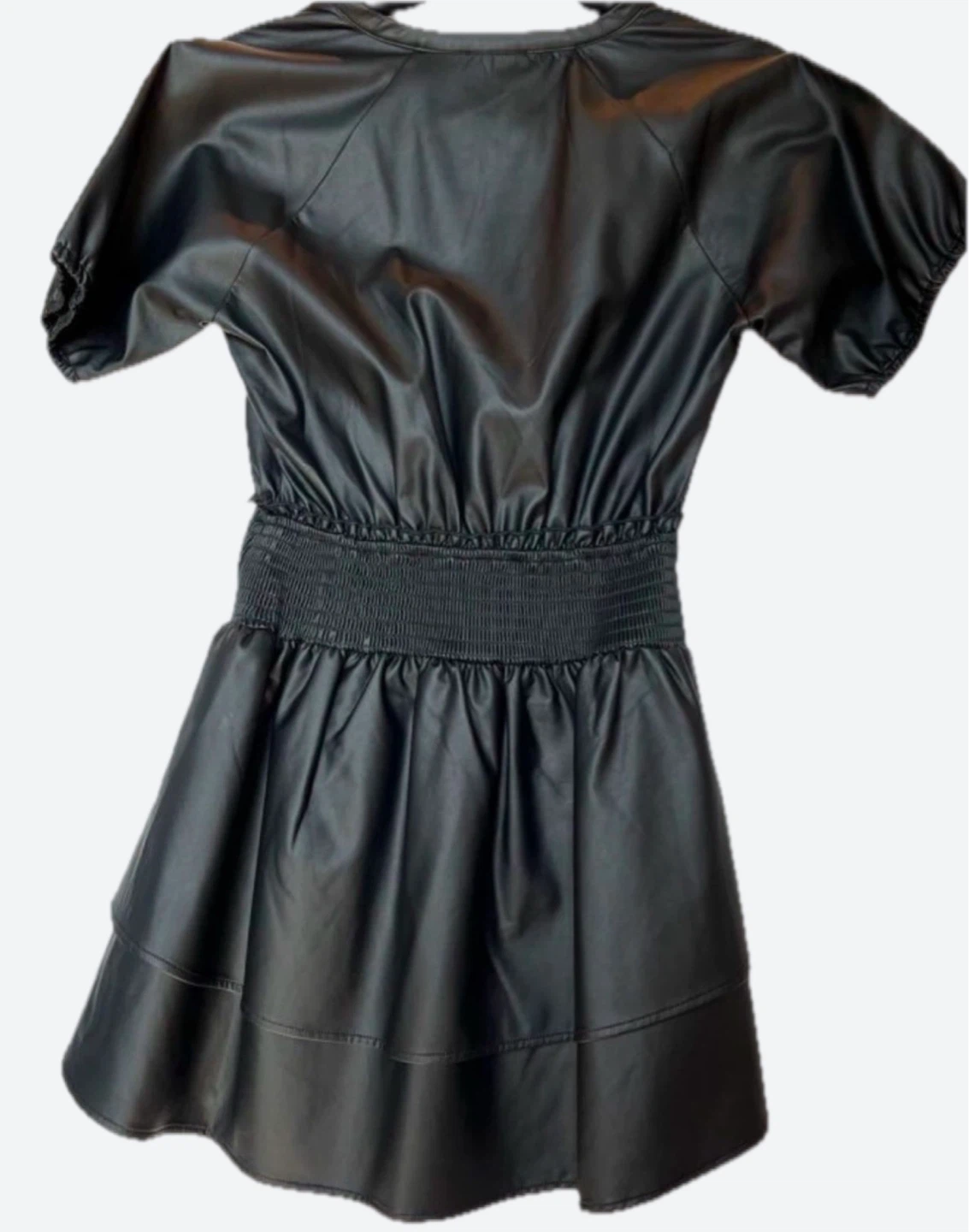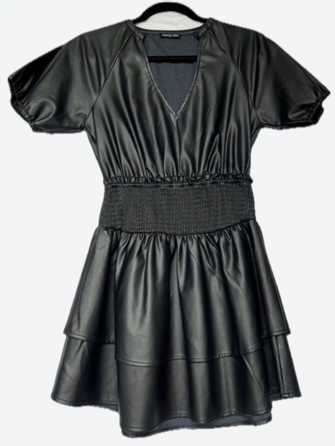 Selling a cute Robertson Rodeo black faux leather mini dress. It's in great condition and perfect for a night out! The dress features a V-neck, short sleeves, and a tiered skirt.