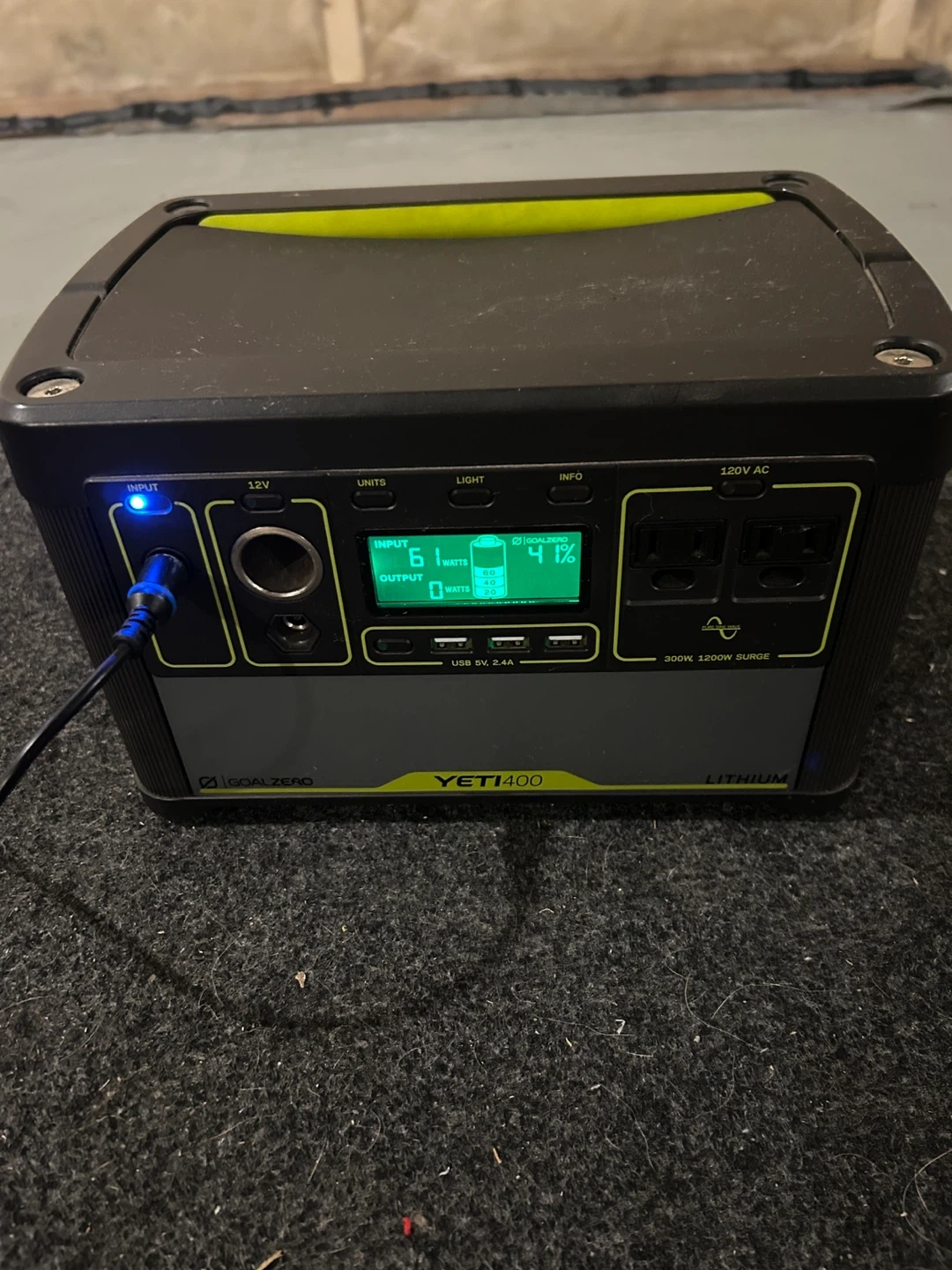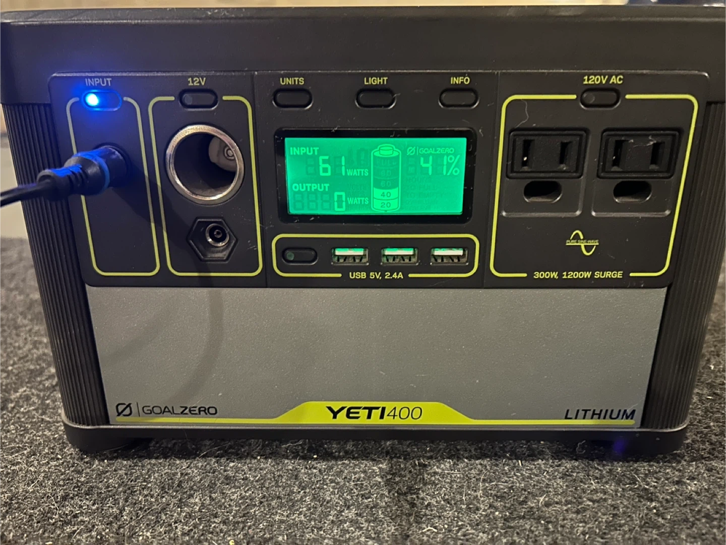 Selling a Goal Zero Yeti 400 Lithium power station along with a Boulder 100 solar panel. I have tested the device and it charges with the solar panel and the wall outlet charger. I have had the battery for a long time and thus cannot confirm the lifespan left.
