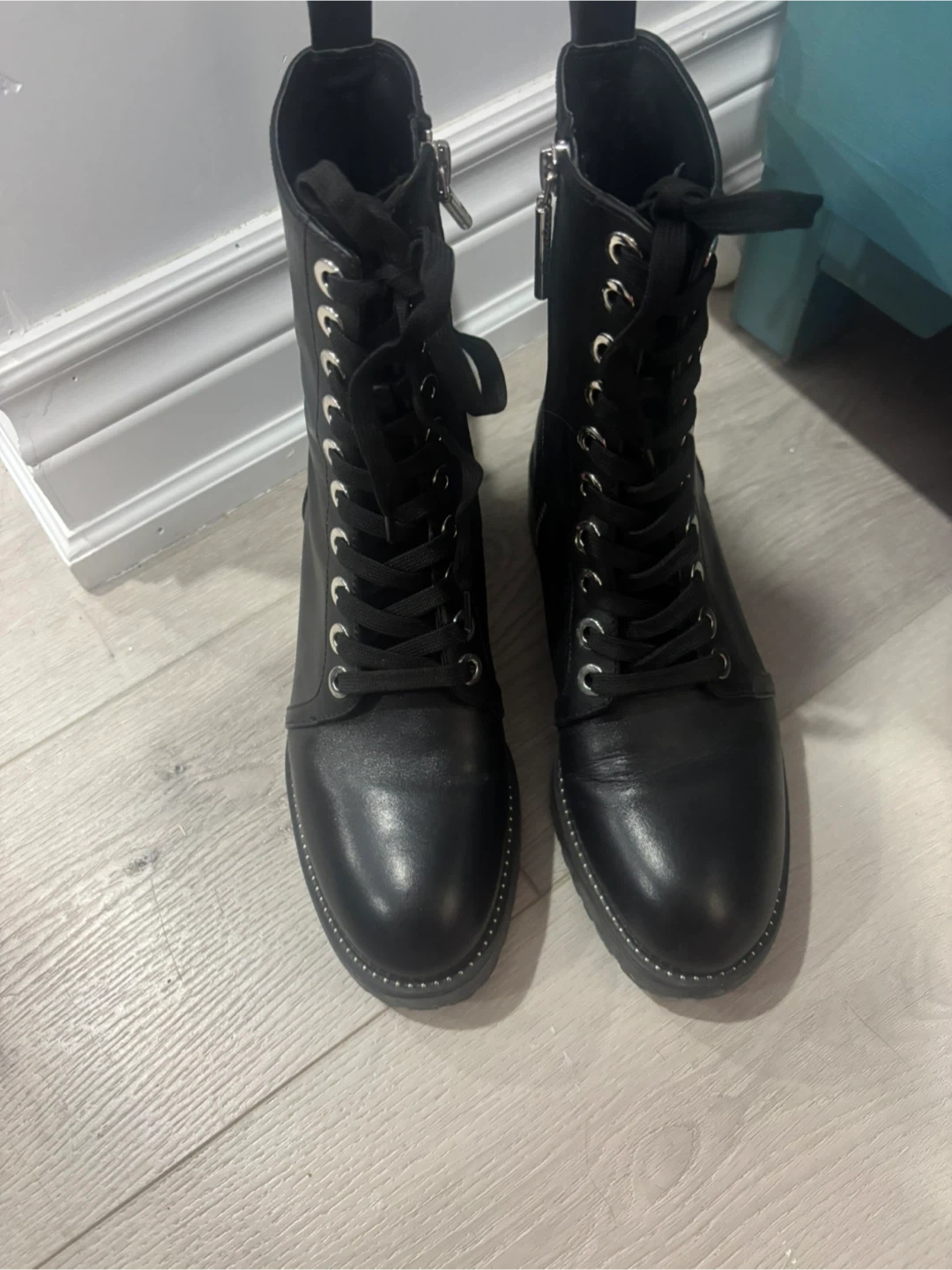 Classic black combat-style boots with lace-up front and convenient side zipper for easy on/off. Timeless, versatile style that works with jeans, leggings, or dresses. Solid construction with a chunky sole for comfort and stability.