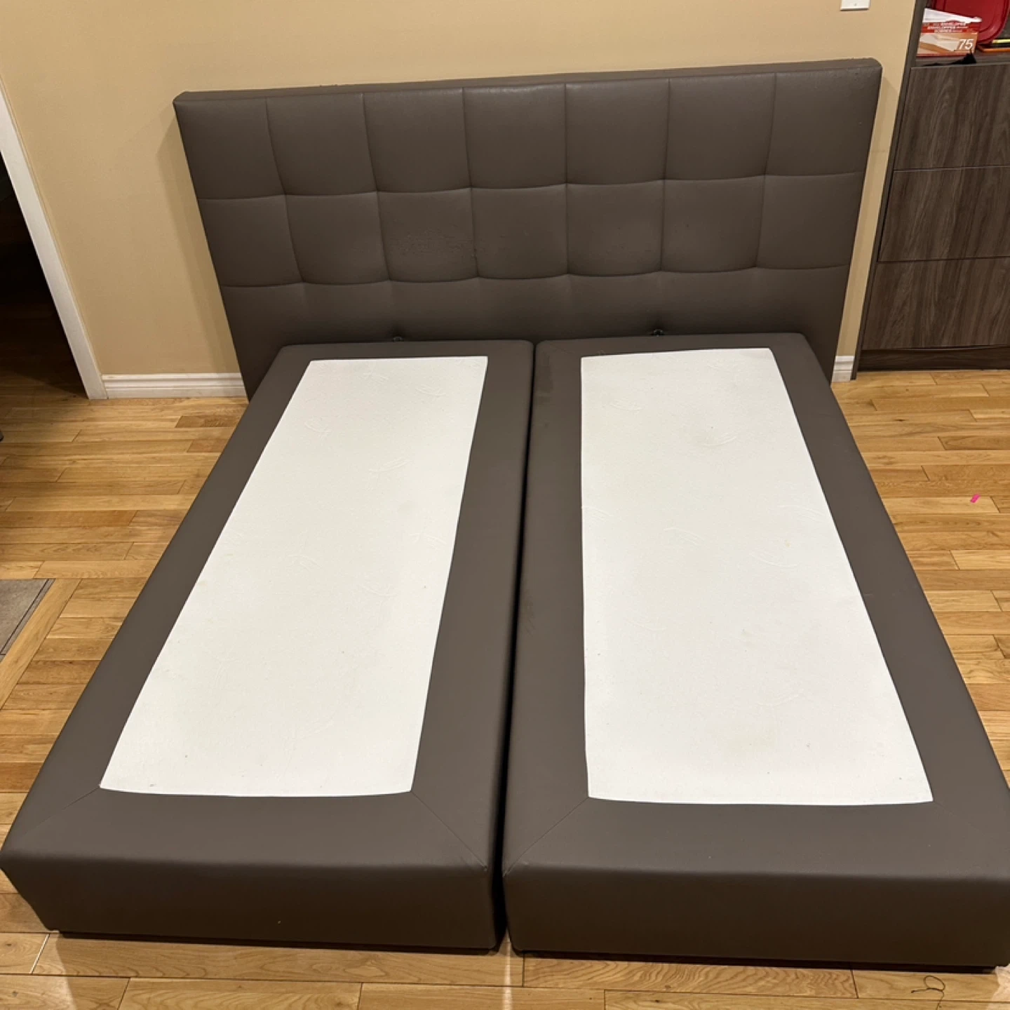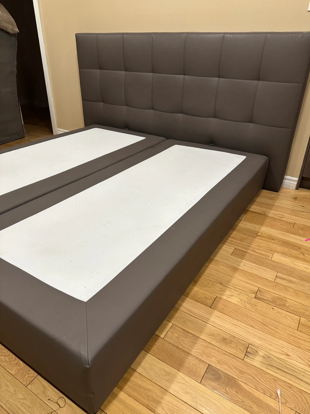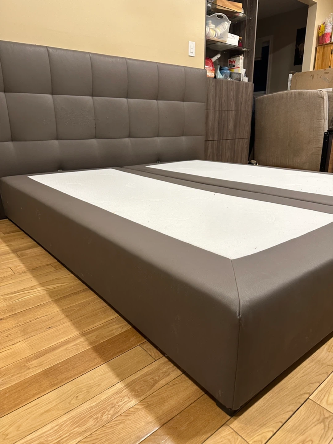 Modern European-style upholstered platform bed with a tall, padded tufted headboard and split base design. Made of faux leather in a sleek neutral grey. Designed to be used without a box spring.