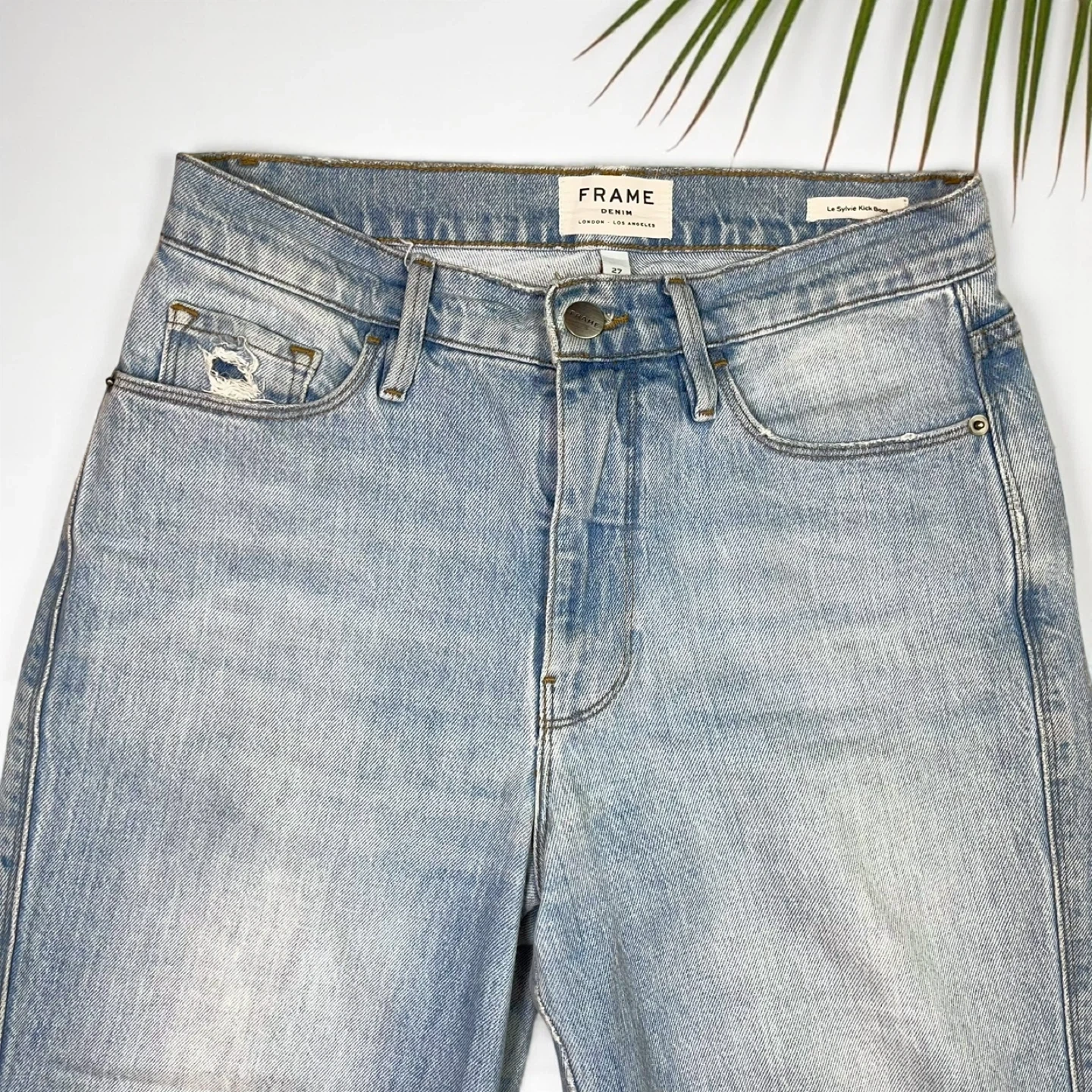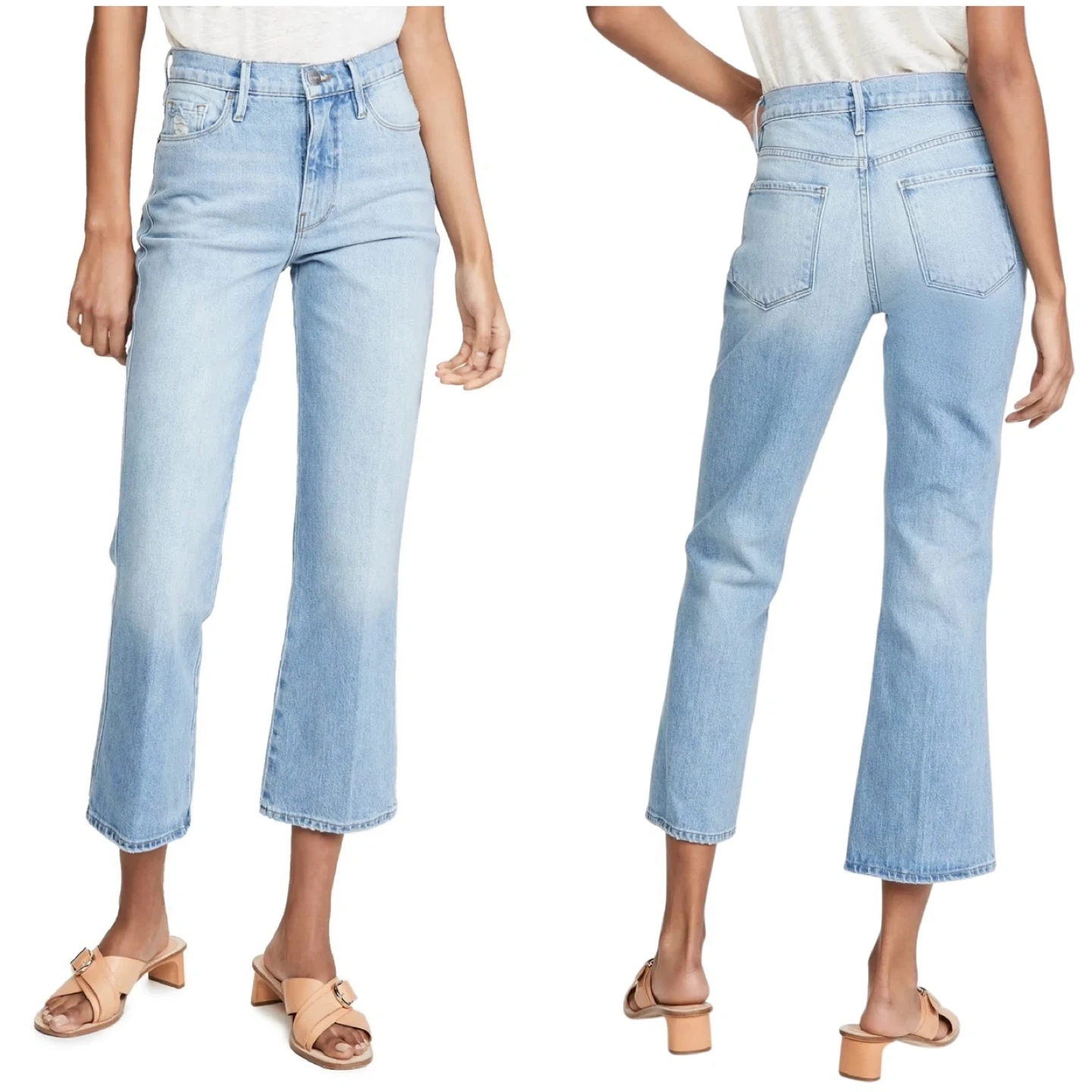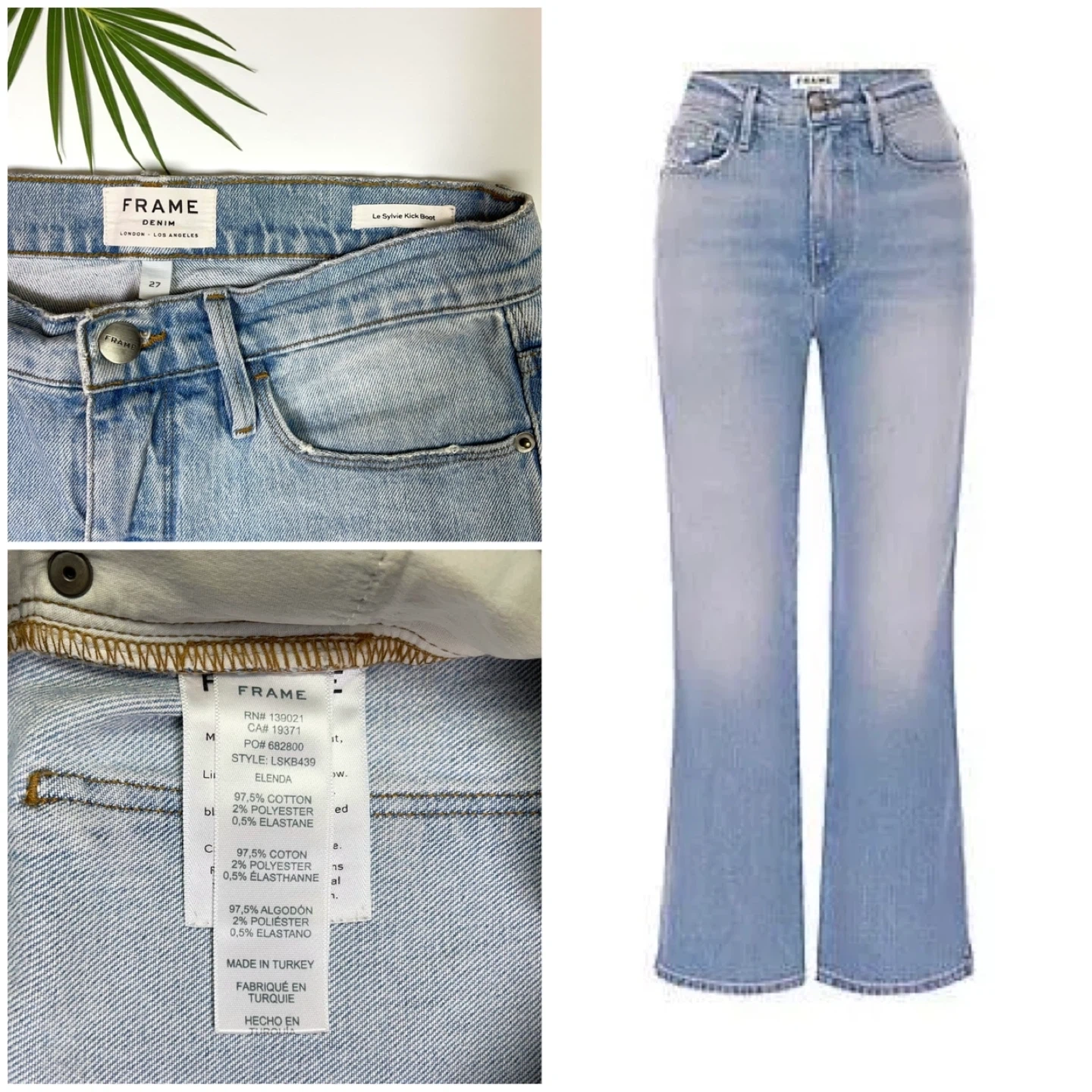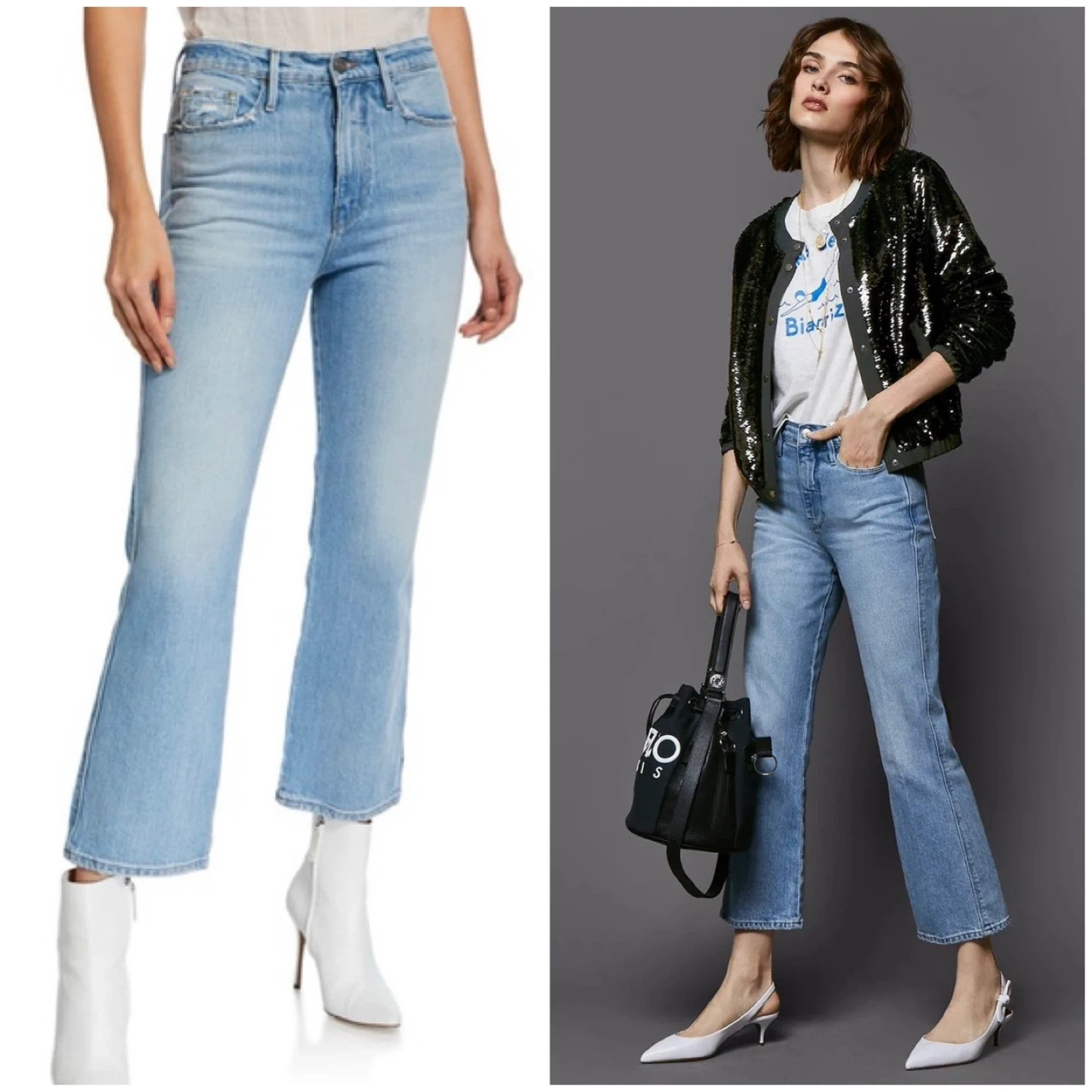 A fresh take on the boot cut, FRAME's signature Le Sylvie jeans are cut with a subtle kick flare for a classic silhouette that flatters the legs, while the high rise offers a structured, elongating fit in their Elena light wash denim with a vintage fade for a lived-in look.