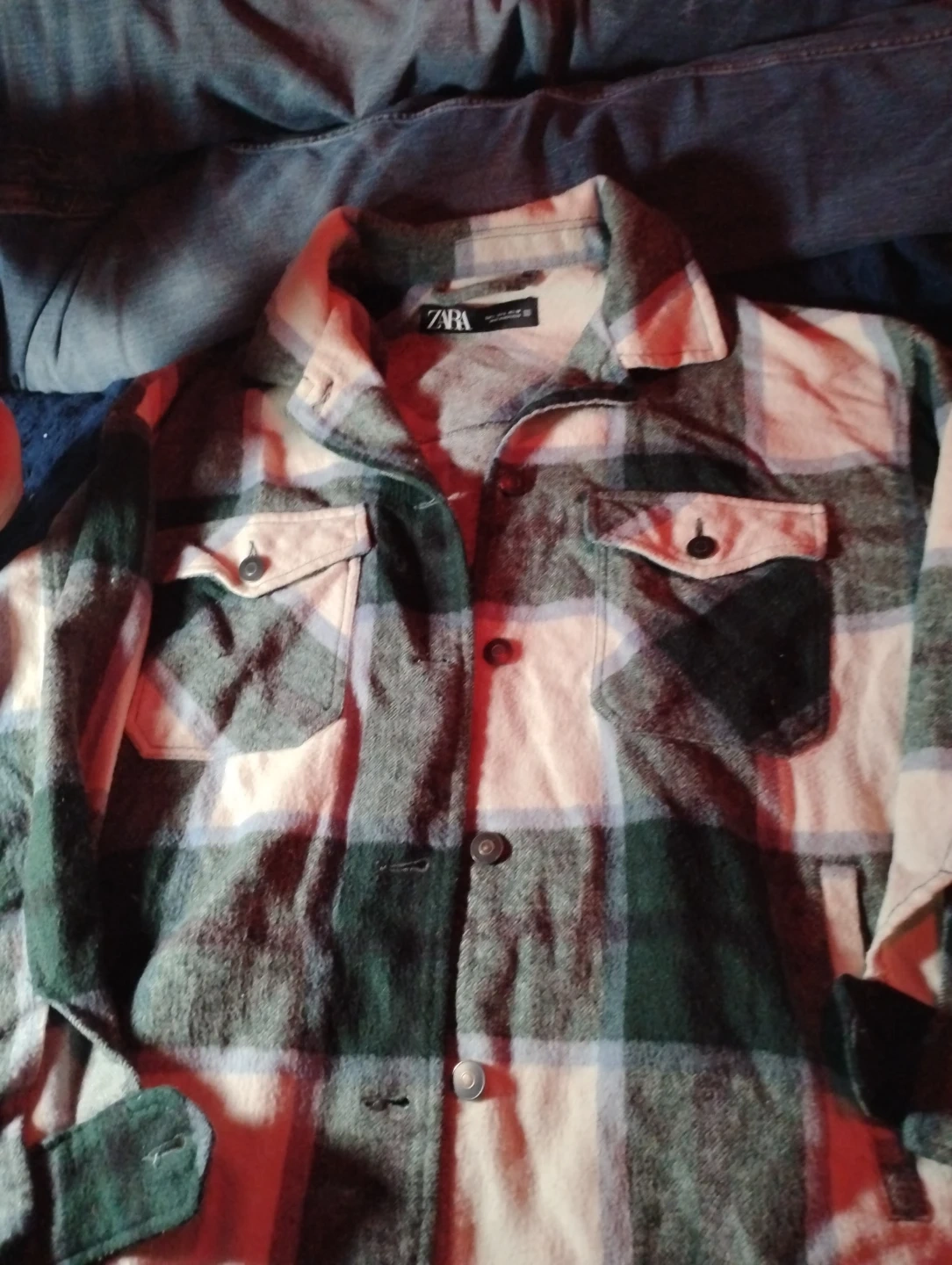 Cozy Zara flannel shirt in a stylish plaid pattern! It features a button-up front and chest pockets, perfect for layering or wearing on its own. Great for adding a touch of casual cool to your wardrobe