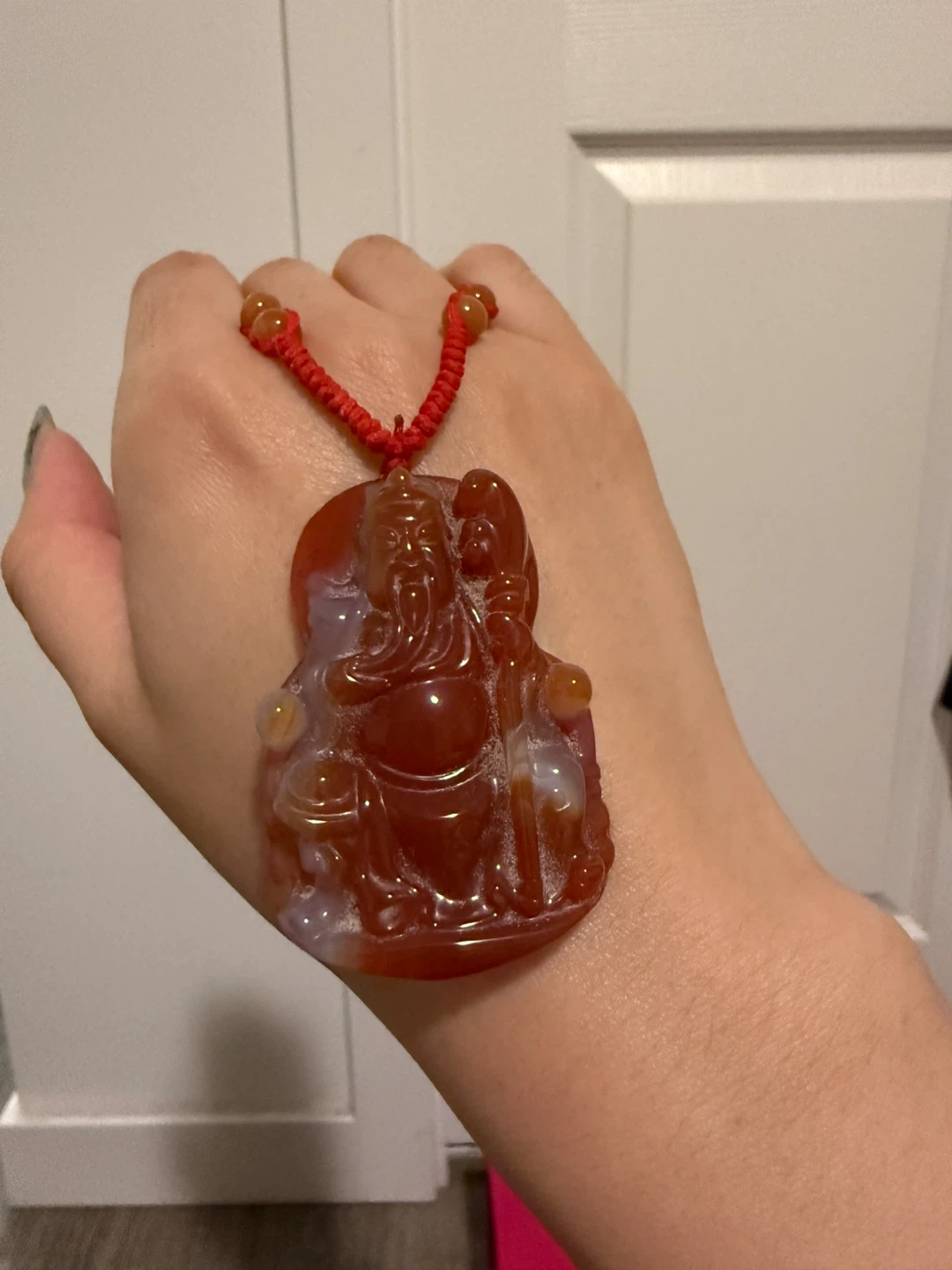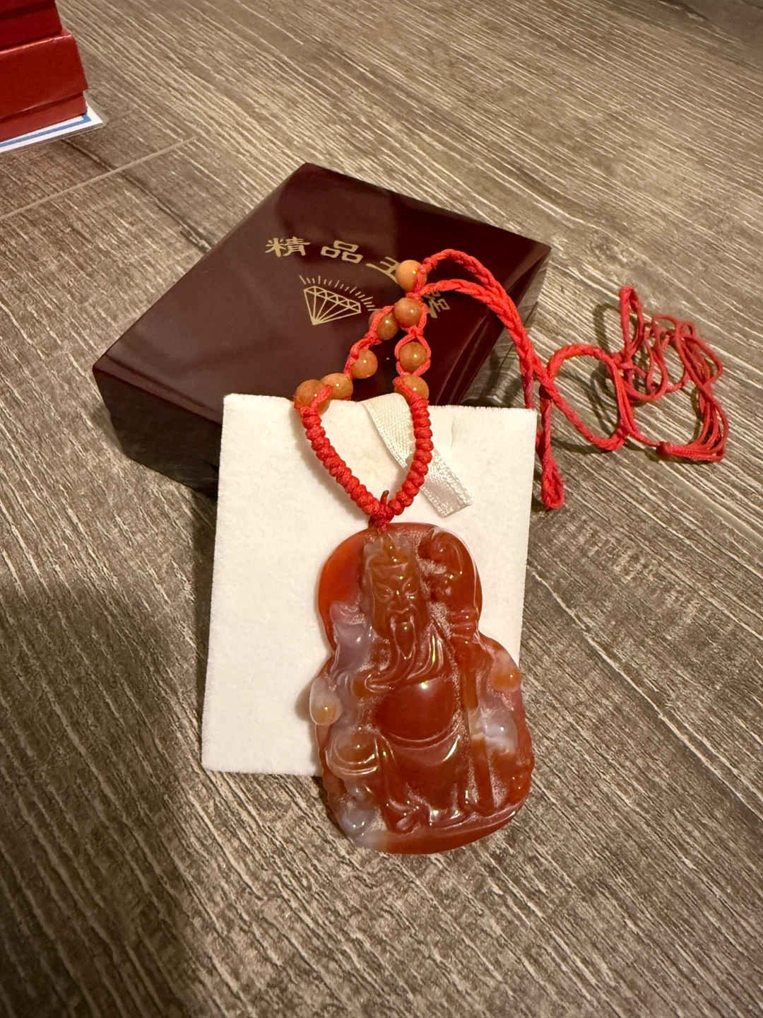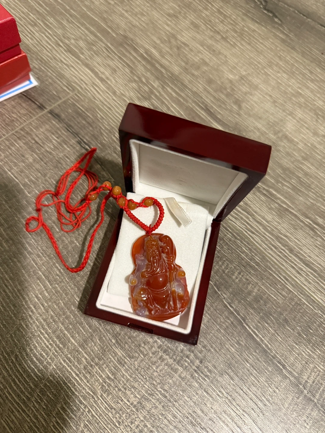 Beautiful red agate pendant featuring a detailed carving. It comes with its original box, making it perfect as a gift or a special treat for yourself. The pendant has a lovely red hue with some lighter inclusions, adding to its unique character. The cord is also red and features small beads.