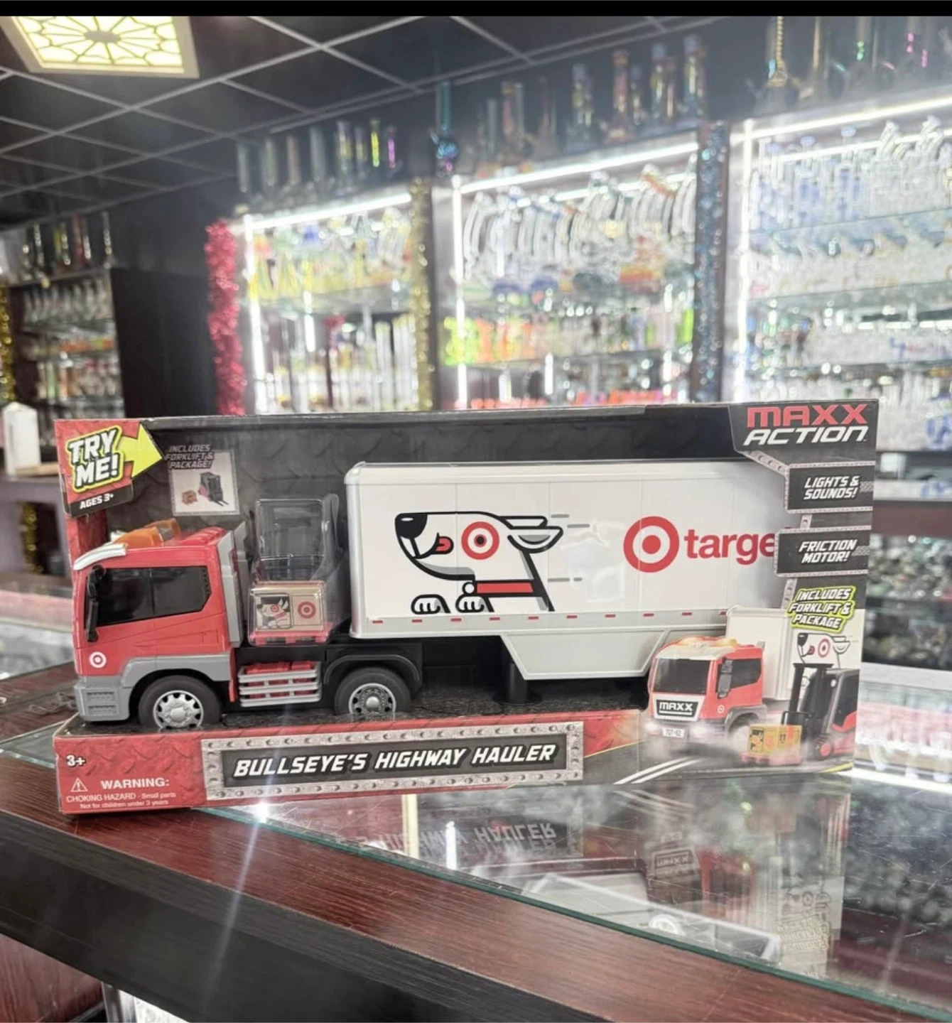 Selling a Target MAXX Action Bullseye's Highway Hauler truck! It includes lights and sounds, and a friction motor. Also includes a forklift and package. Recommended for ages 3+
