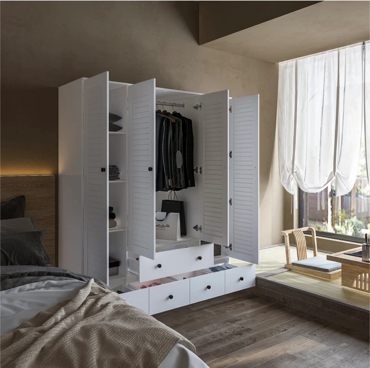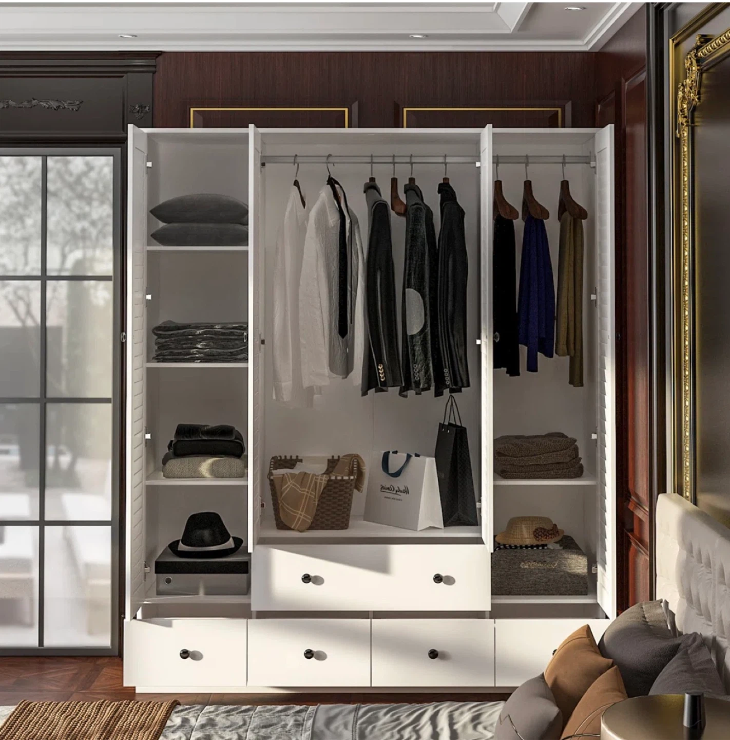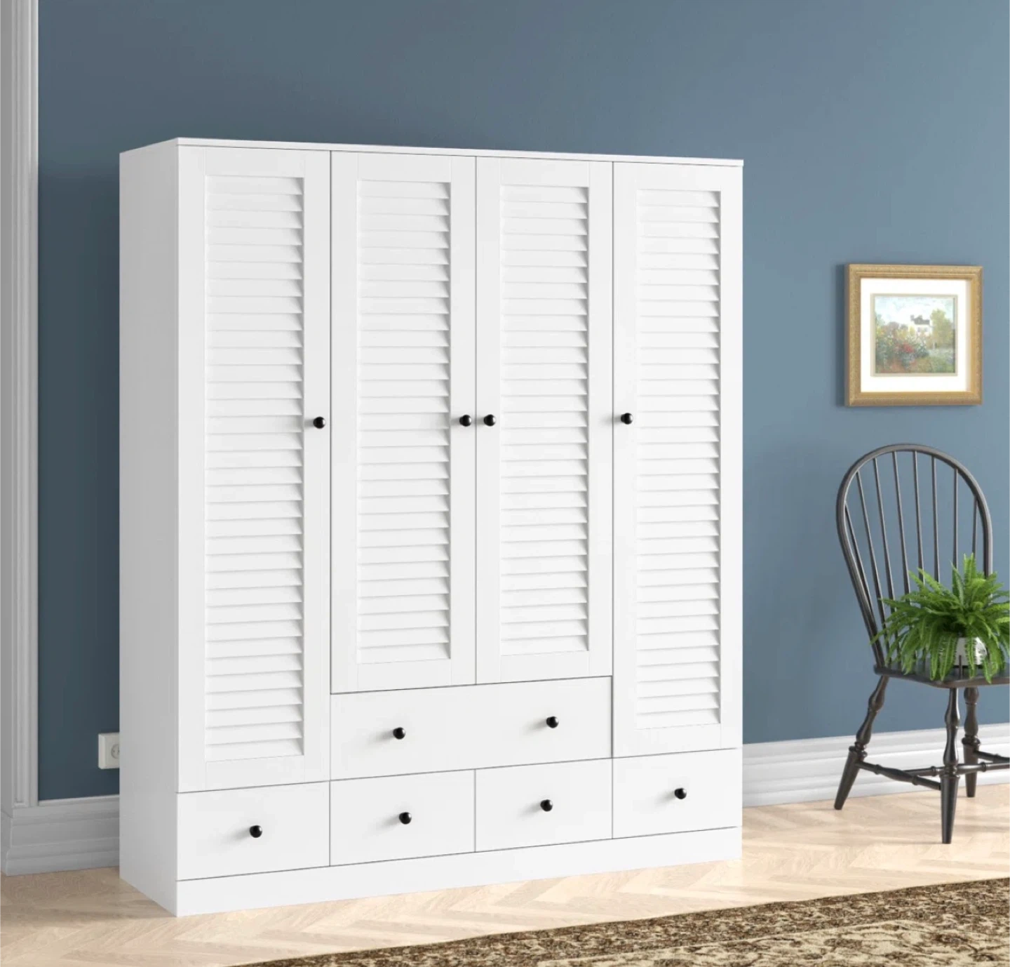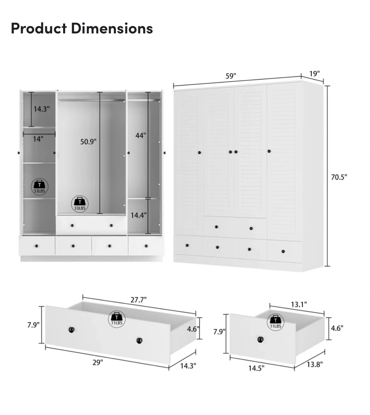 This white wardrobe offers ample storage with its multiple shelves, hanging rods, and drawers. Perfect for organizing your clothes and accessories! Dimensions are approximately 59" wide, 19" deep, and 70.5" high. The drawers vary in size, with the larger ones being about 29" wide and the smaller ones around 14.5" wide