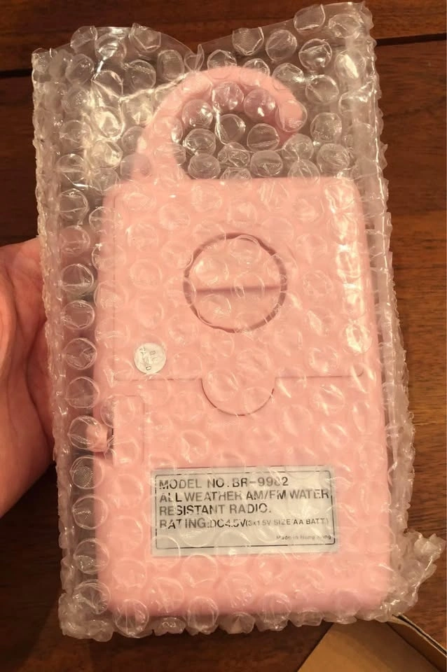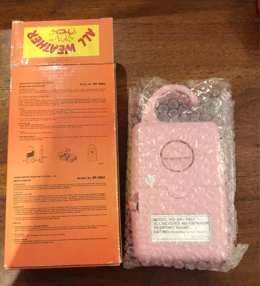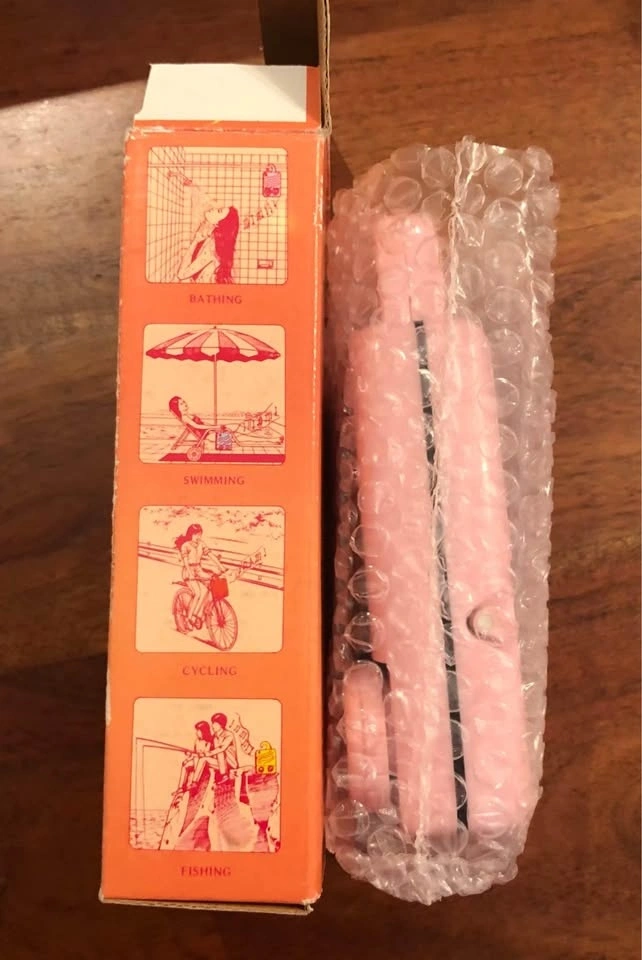 A Vintage Mint in box Pink Water Resistant AM/FM Radio made in Hong Kong.