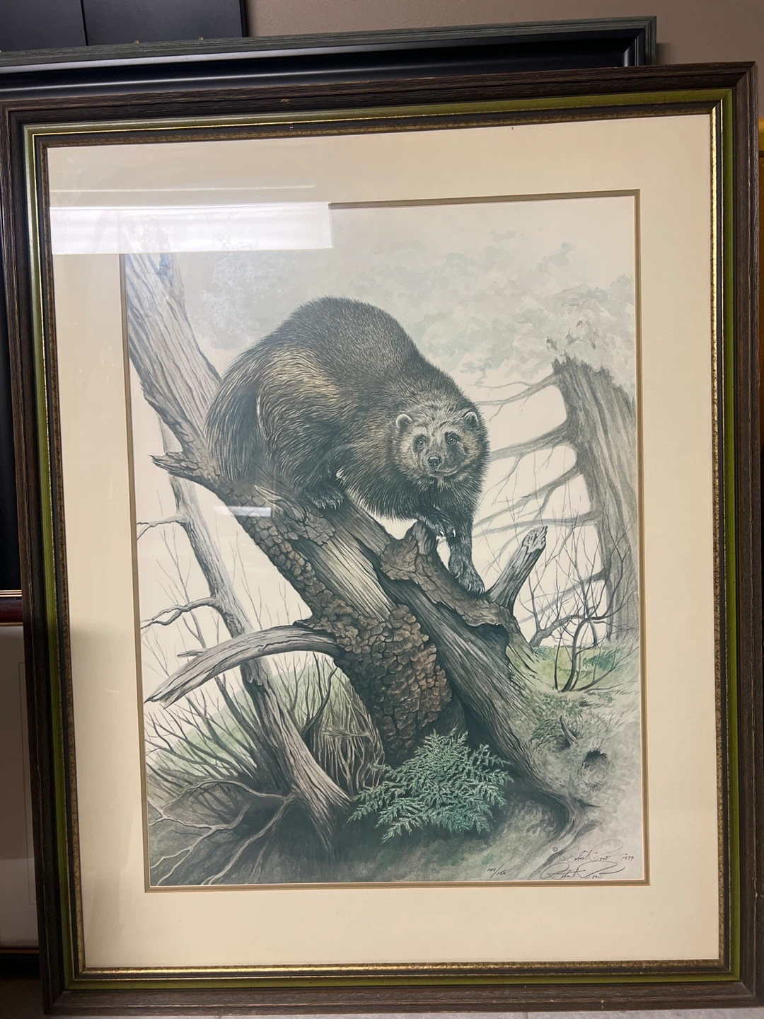 Here's a framed print featuring a wolverine in a forest setting. It's ready to hang and would look great in a cabin or nature-themed room. Artist Robert