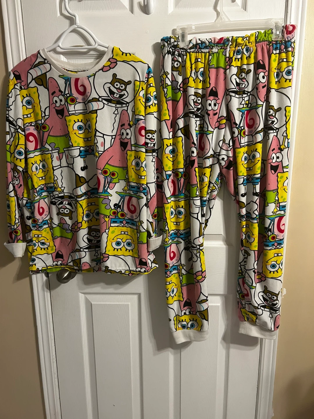 Cozy Spongebob Squarepants pajama set in size L! Features a fun, all-over print of Spongebob and friends. Perfect for lounging around the house or a good night's sleep.