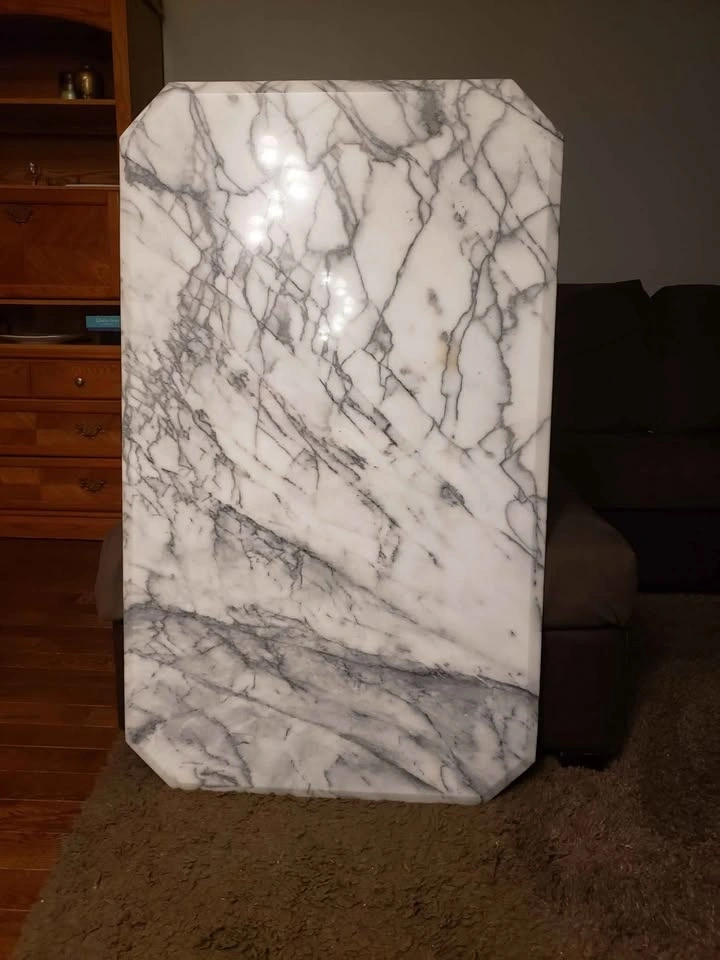 4ft by 2ft, 2.5 ft height, 3/8th inch thick natural marble coffee table. Legs are 40 pounds each and the top is 90 pounds. No chips or cracks.